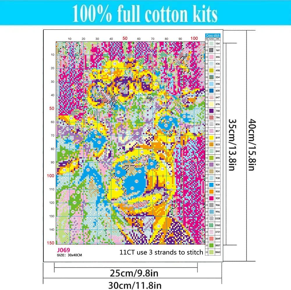 Pre-printed Pattern Fabric:The cross stitch patterns is clearly printed with small squares which are coloured and marked with symbols. Each symbol corresponds to a cross-stitch thread color. The symbol is written on the chart, and the corresponding thread color is written below the chart.