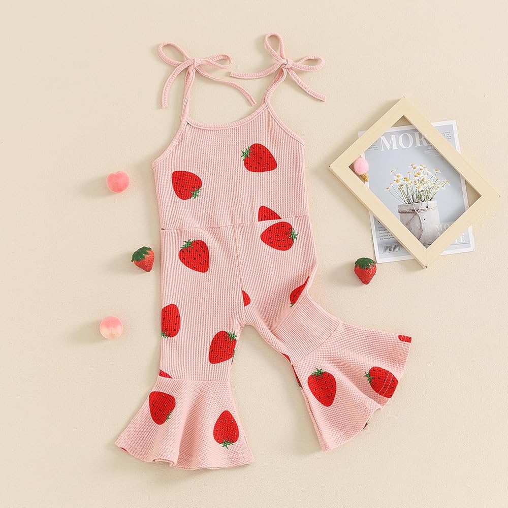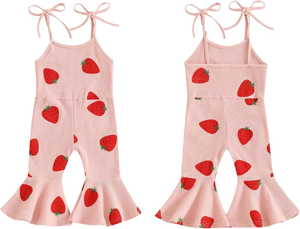 🍓【Why You Buy It】: Toddler girl bell bottom outfits, strawberry print toddler girl summer jumpsuit, flared legs design, waffle spaghetti straps strawberry jumpsuit, sleeveless, tank jumpsuit, casual jumpsuit, toddler girl bell bottom jumpsuit, floral print elastic waist bell bottom pants jumpsuit, flare pants overalls, toddler girls romper, bell bottoms for toddler girls, toddler girl bell bottoms.