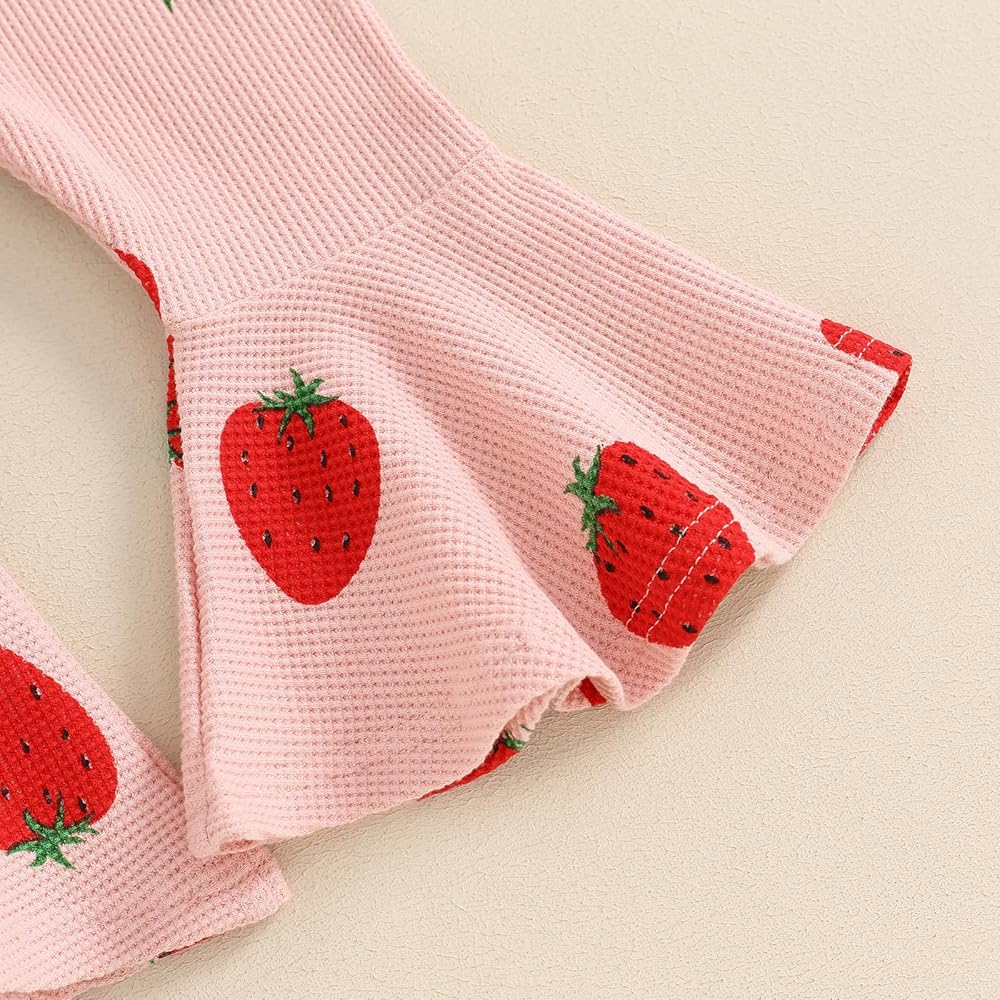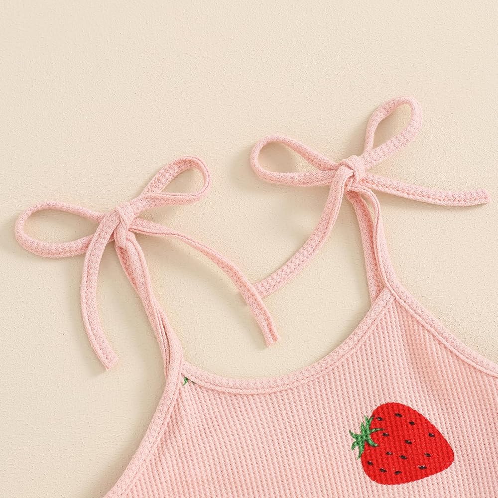 🍓【Material】: Baby girl strawberry outfit, baby girl flared jumpsuit, baby girl suspender overalls, is made of high-quality 95% Cotton, 5% Polyester, comfortable and skin-friendly, stretchy, comfortable to wear, strawberry baby girl outfit can be hand washed and machine washed.