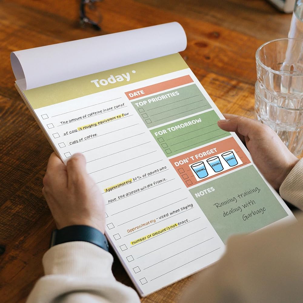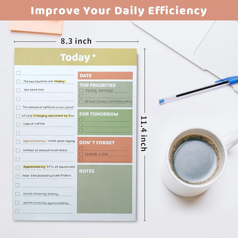 【A4 Large Size】11.4*8.3 inch A4 per sheet including DATE / TOP PRIORITIES / FOR TOMORROW / DON'T FORGET NOTES categories, so you have enough space to record daily or even weekly to-do list, large space to write as you wish