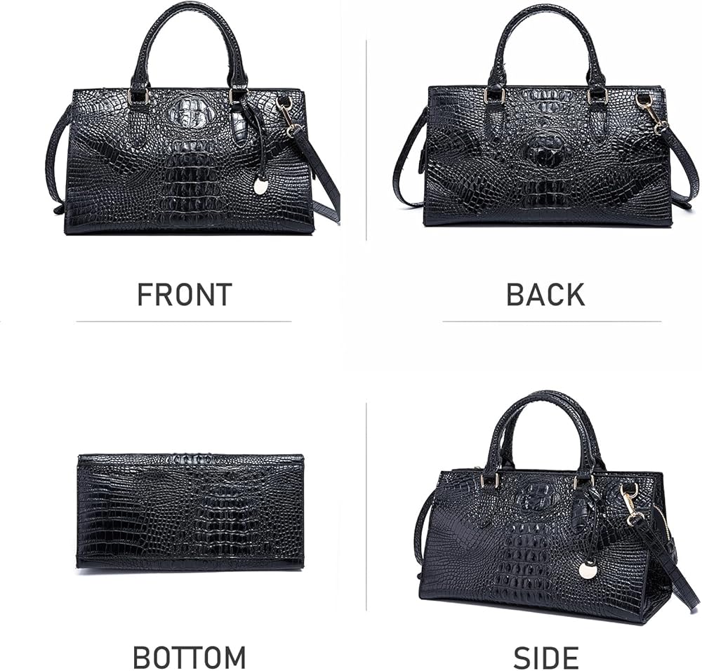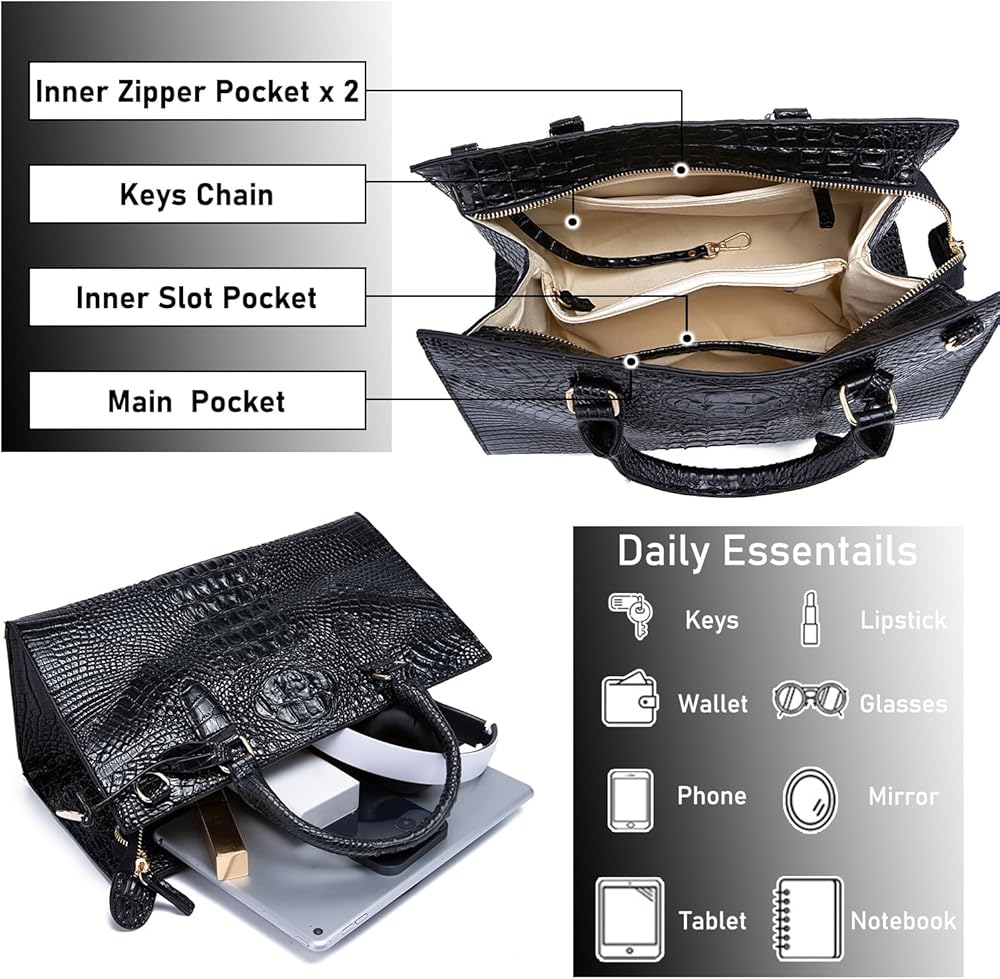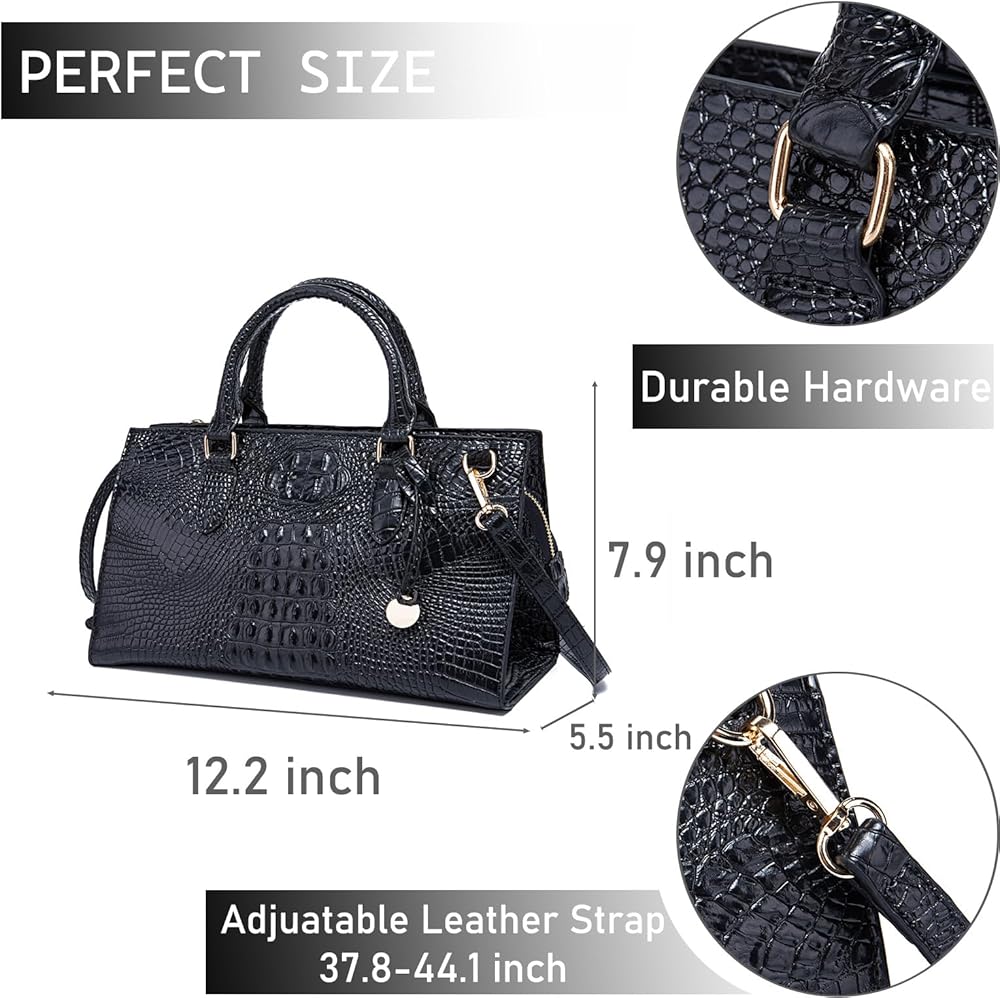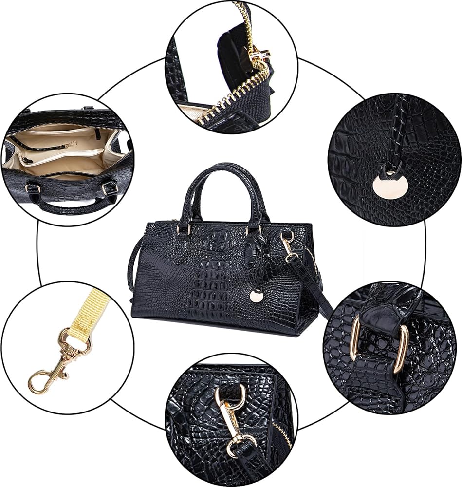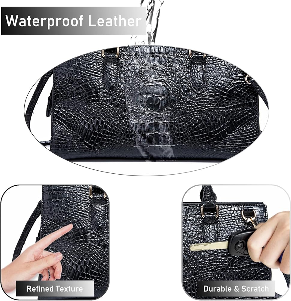 High Quality Material: This handbag is made of high-quality, water-resistant, and scratch-resistant faux leather with a crocodile print. The shiny and textured exterior, along with the gold zippers and sturdy hardware, adds to its durability and stylish appeal. The soft and comfortable lining ensures the protection of your belongings