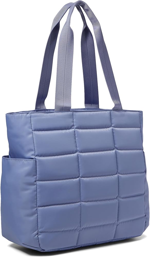 The Camden sustainably made tote stores everything efficiently. It features puffer quilting and is made to last. It has two side pockets and a spacious interior with an interior zip pocket.