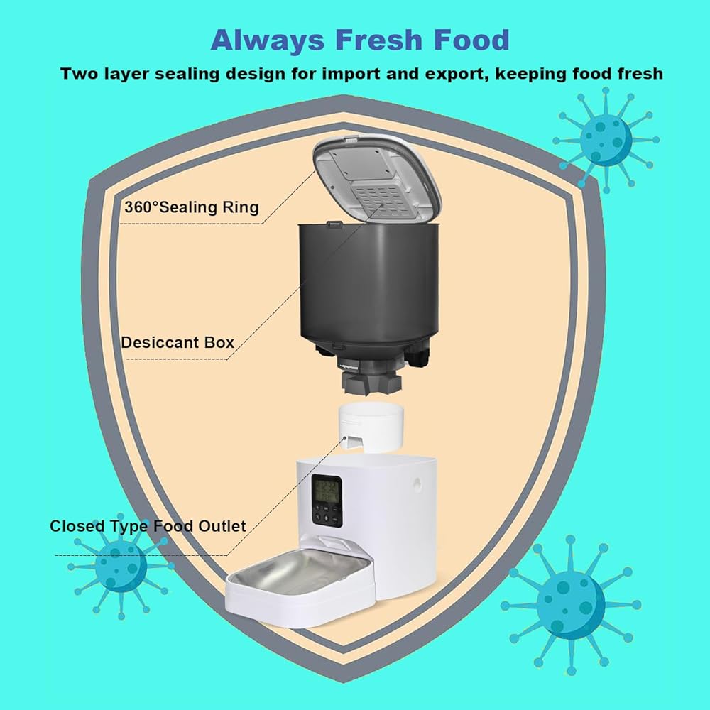 【Fresh food prioritizes health】-The automatic cat feeder features a finger broadcasting lid opening device at the top to prevent your pet from stealing food. We have designed a desiccant placement box in our food dispenser, the design can completely isolate the air to prevent food from getting damp and moldy. We have included a desiccant to ensure the freshness of pet food.