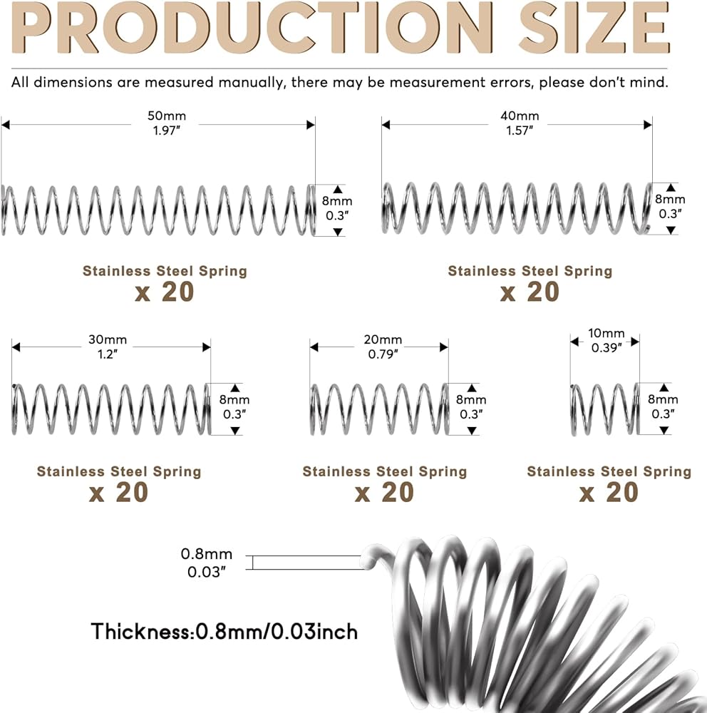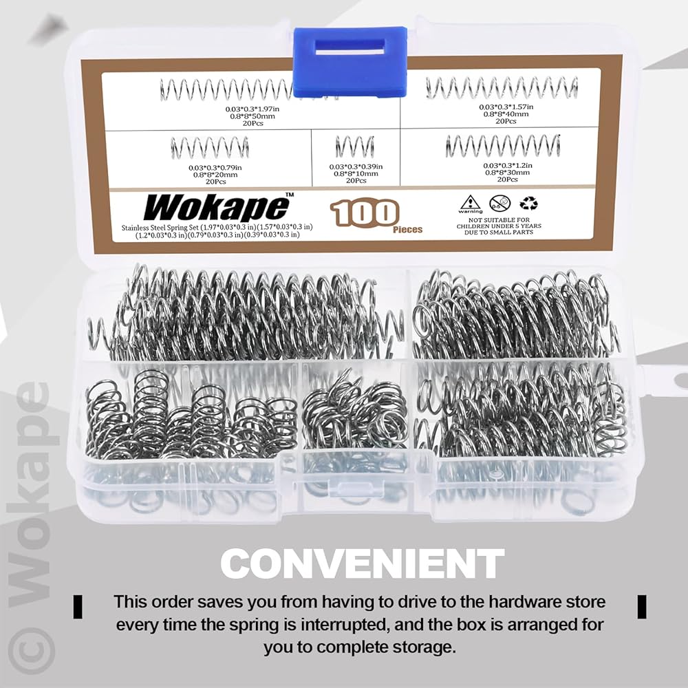 💓 Wokape 100Pcs Compression Springs Assortment Kit, 5 Sizes Mini Stainless Steel Extension Springs for Shop and Home Repairs, 0.8mm Wire Diameter, 8mm OD, 10/20/30/40/50mm Length 💓