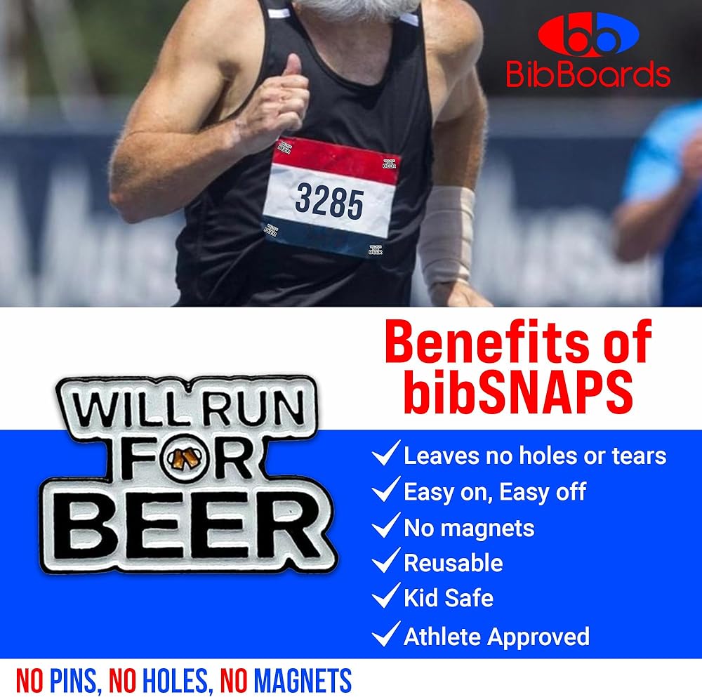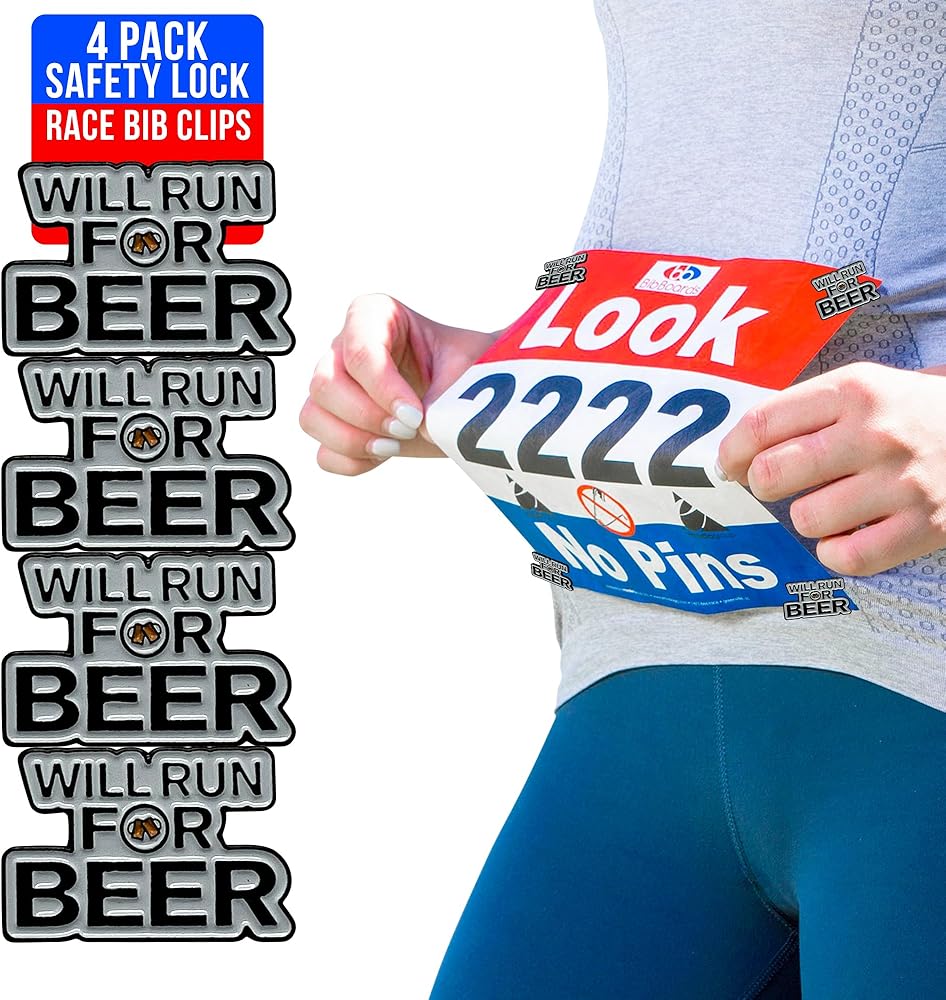 BibBoards Metal Enamel Will Run for Beer Event Clips - Snap & Lock bibSNAPS for Runners, Non-Magnetic Race Bib Holder for Marathon, Safety Lock Race Clips, Runner Number Holder - 4 Pack