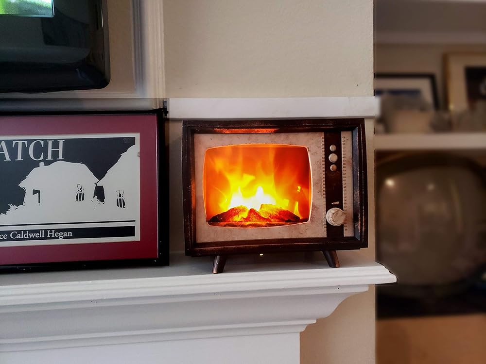 Christmas DECOR - Spooky flame effect fireplace LED Flames inside a Retro TV. You can dim the lights by using the tuning dial on the front of the faux television.