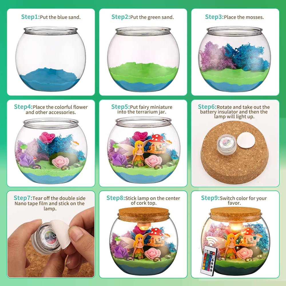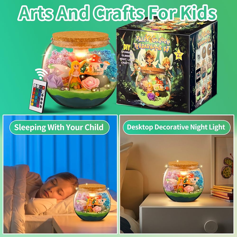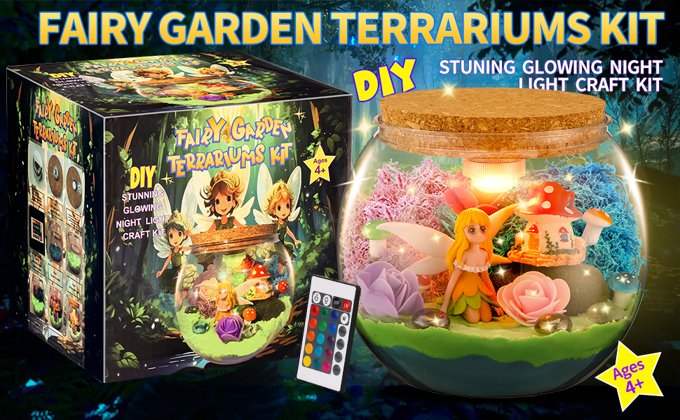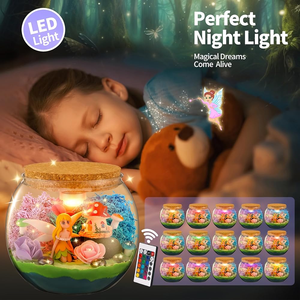 🥰【Unique Fairy Garden Terrarium Kit】 DIY fairy kids art kit comes with a transparent terrarium jar, 3 colorful flowers, a fairy figure, 2 bags different color magic sand, a 16-colored LED night light with remote control and others miniature fairy garden accessories. Funny arts and crafts for kids 4-6 that unleash kiddos' creativity and imagination.