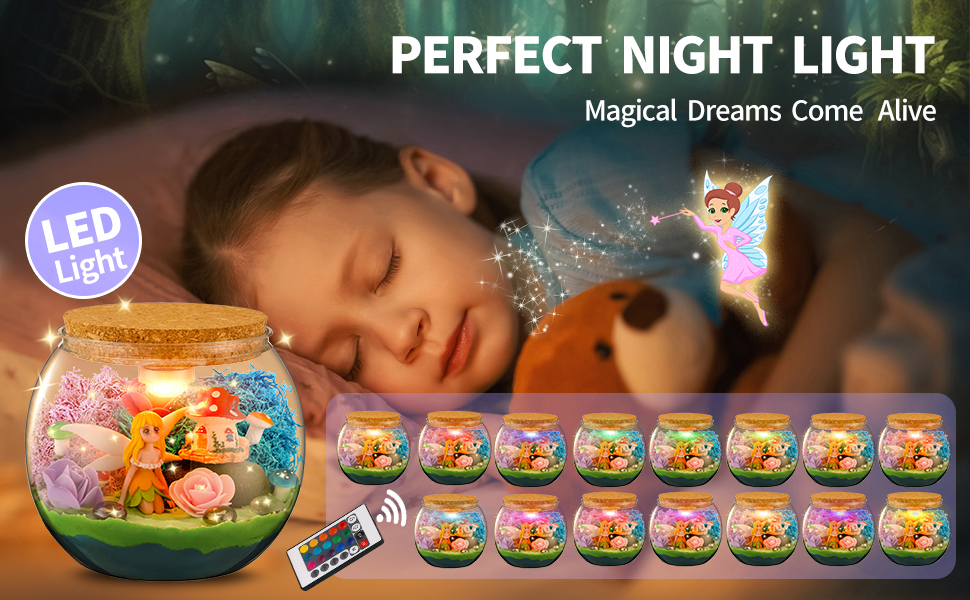 🔮【Remote Control Night Light】 This kids fairy crafts night lights terrarium kit comes with 16-colored remote control and adjustable LED light. Perfect arts & crafts supplies creative toys for kids ages 8-12. Boys girls can select their favorite color and brightness by adjusting the remote control which has 4 dynamic modes(flash, smooth,strobe, fade). Magical night light suitable for bedroom, living room and children's room. Nice home decor while company children sleep at night.