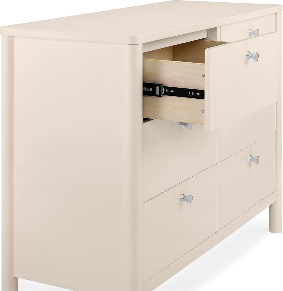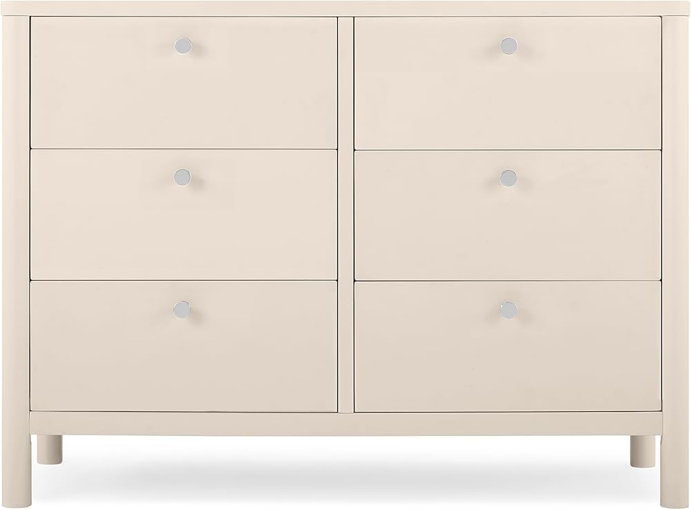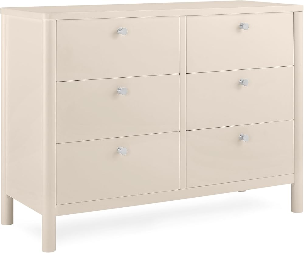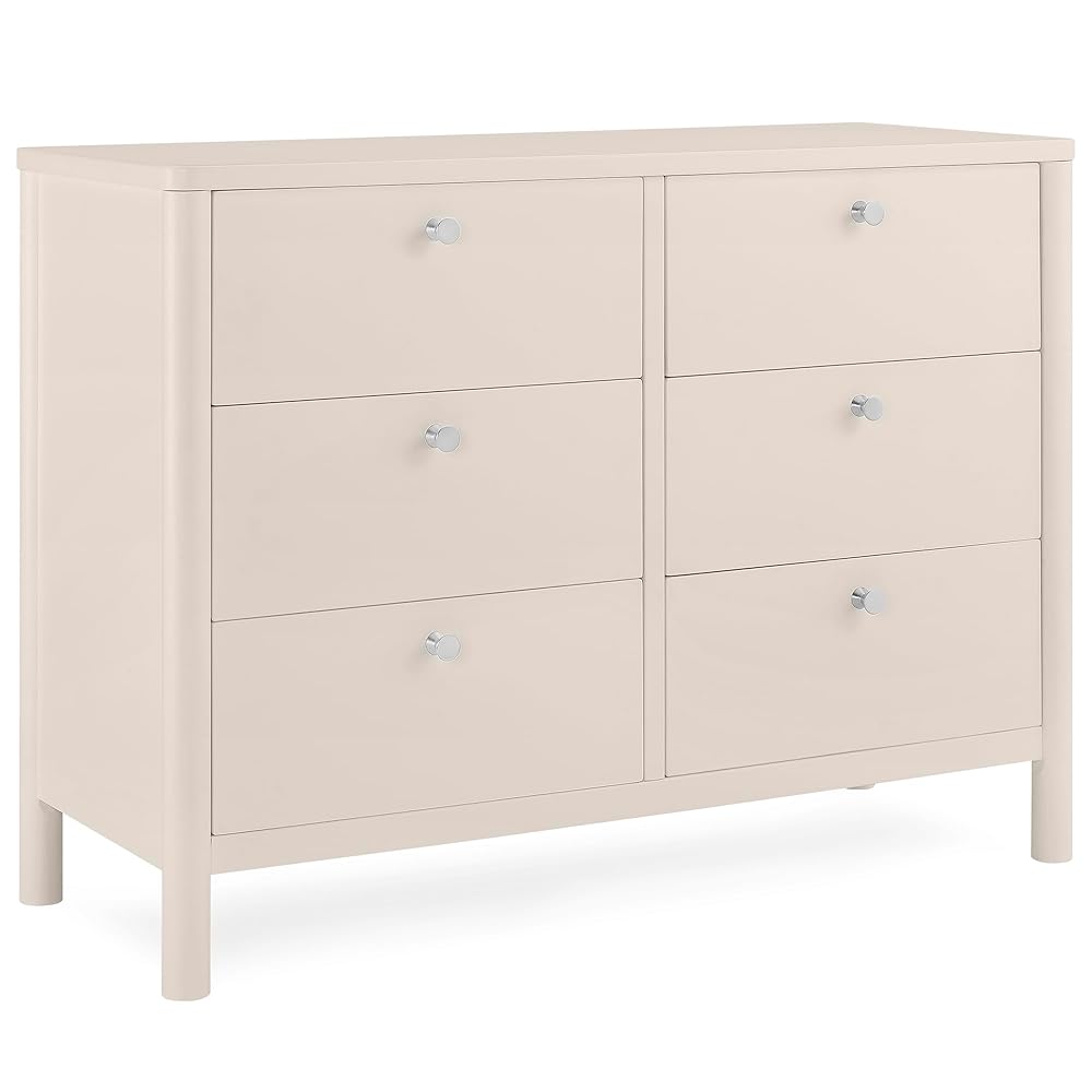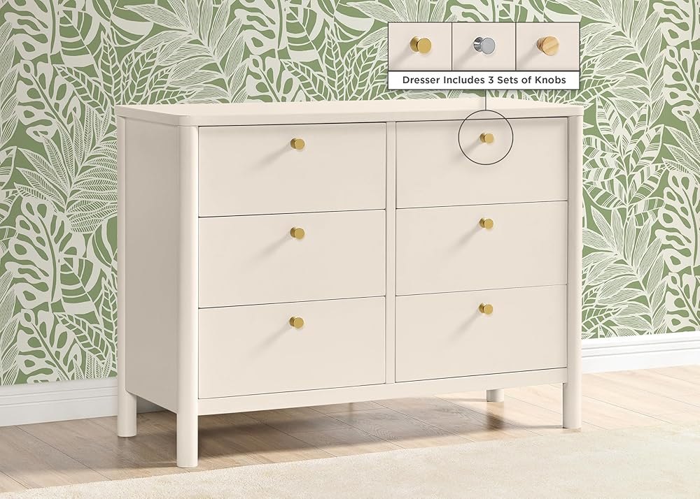 The mid-century design of the Brooks 6 Drawer Dresser with Interlocking Drawers by Delta Children will anchor any nursery with welcoming and timeless style. Modern circular legs, clean lines complete the look of this must-have dresser. With multiple sets of knobs included, kids (or parents!) can choose to mix and match hues or showcase their favorite. For your child's safety, this dresser is outfitted with an interlocking drawer system that limits the number of drawers that can be opened at one time. Available in Bianca White and Midnight Grey. Finish your nursery with coordinating pieces from the Brooks Collection.