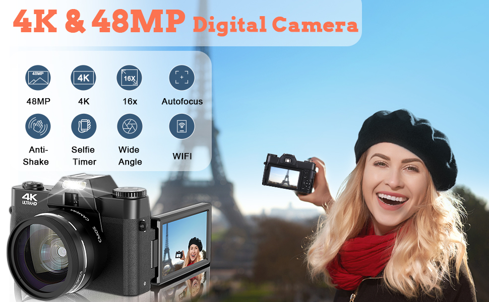 【48MP & Autofocus for Photography】Our digital camera delivers high-bit-rate 4K-resolution video and clear image at 48MP. 18x zoom allowing you to capture incredible moments with exceptional clarity. By just one-click you can take real auto focus and anti-shake photos.