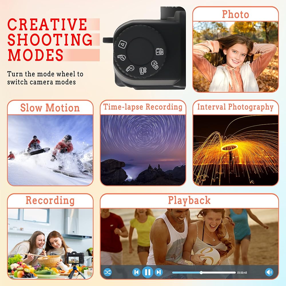 【Multifunctional 4K Point and Shoot Camera】4k digital cameras for photography have multi-function,such as DIY panel, dual cameras, continuous shooting, anti-shake,face capture,And video pause function helps save editing time and memory, and time-lapse and slow-motion features create the creativity you want!
