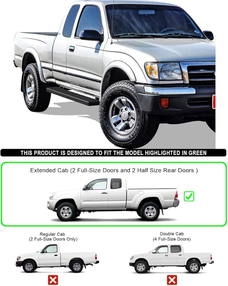 Great looking CAB LENGTH nerf bars, Compatible with Toyota Tacoma 1995-2004 Extended Xtra Cab (4WD or Prerunner 2WD 4WD)