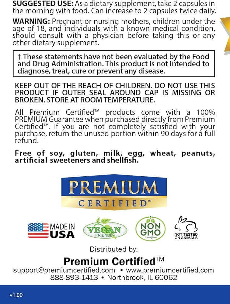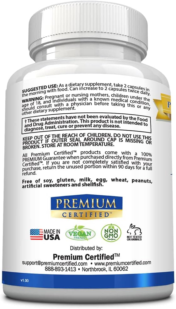 Locally made, vegetarian, vegan: All Premium Certified products are manufactured in the USA in a cGMP approved factory for high quality and safety.