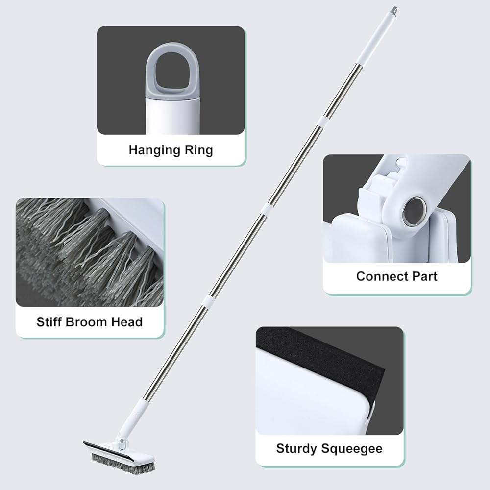 ✨【 Floor Scrub Brush】 Features large long stiff bristles,Grout Brush fits perfectly into the grout line.It has very hard bristles, and would be best for cleaning tiles and outdoor decks and walkways. Makes Cleaning Grout a breeze. adjustable Long handle scrubber for bathroom floors and works well for people with back problems.designed to clean floor, wood deck, garage, patio, concrete, rug, outdoor, kitchen, balcony in a breeze,crevices, tile, narrow space.