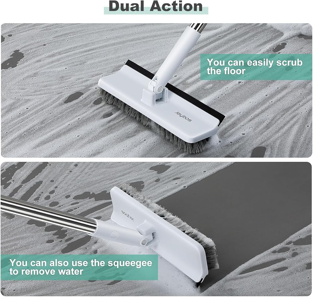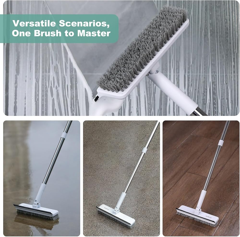 JOYBOS Floor Scrub Brush with Long Handle, 2 in 1 Scrape and Heavy-Duty Stiff Bristle Scrubber with Squeegee, 55" Tool for Cleaning Grout Bathroom, Bathtub, Tub, Tile Floors, Garage and Patio Deck
