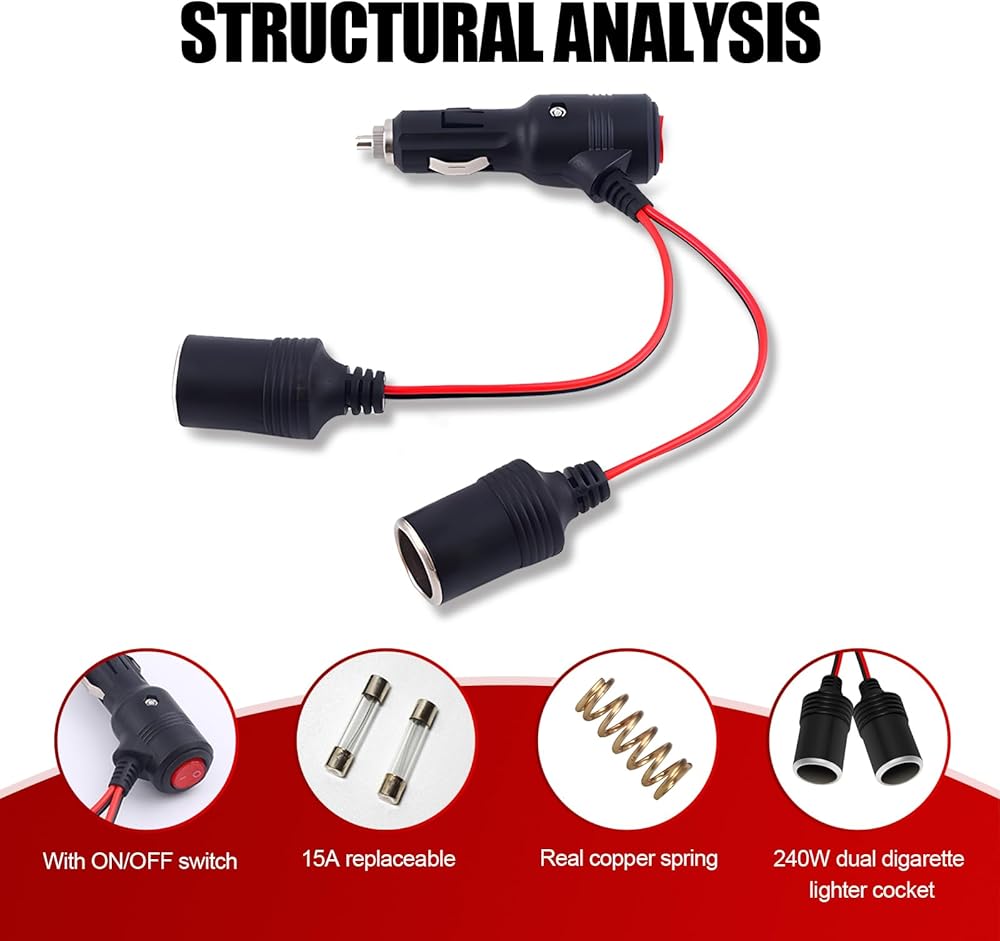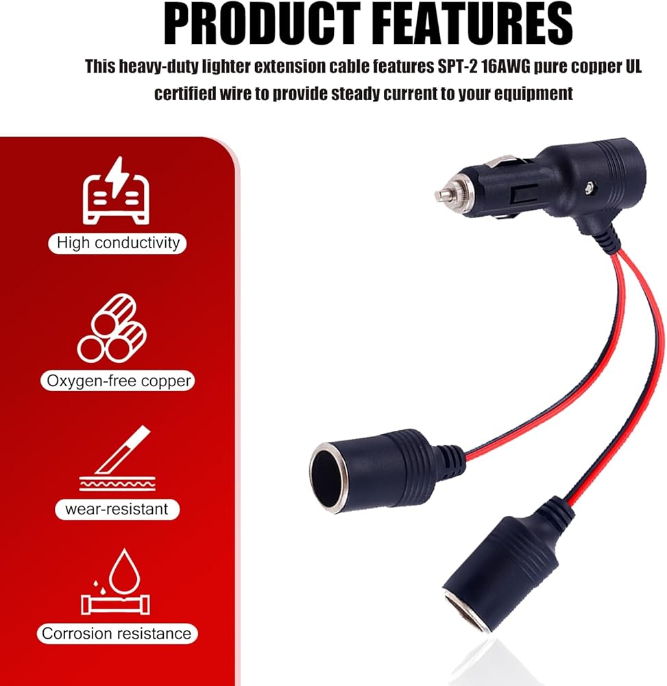 1 to 2 Cigarette Lighter Splitter: This cigarette lighter splitter splits 1 car cigarette lighter port to 2 DC ports. The 2-way cigarette lighter adapter extension cable allows you to connect two devices at the same time, meeting your needs for more car cigarette lighter power ports.