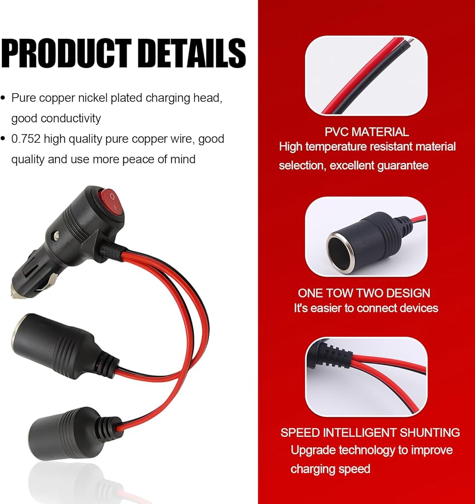 Irinidig 1 PC Car 1 to 2 Cigarette Lighter Extension Cable,Y-shaped Cigarette Lighter Socket Splitter with Switch Indicator Light, 2-way Female Power Port Adapter, Universal for Cars (Black & Red)