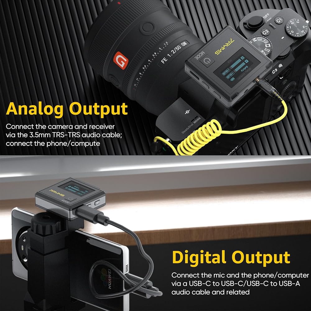 Support USB-C Digital Output: Enjoy digital and analog output modes, making the DW30 wireless microphone universally compatible with cameras, phones, and computers. Connect via USB-C for digital output or the 3.5mm port for analog output, adapting to various recording devices effortlessly.