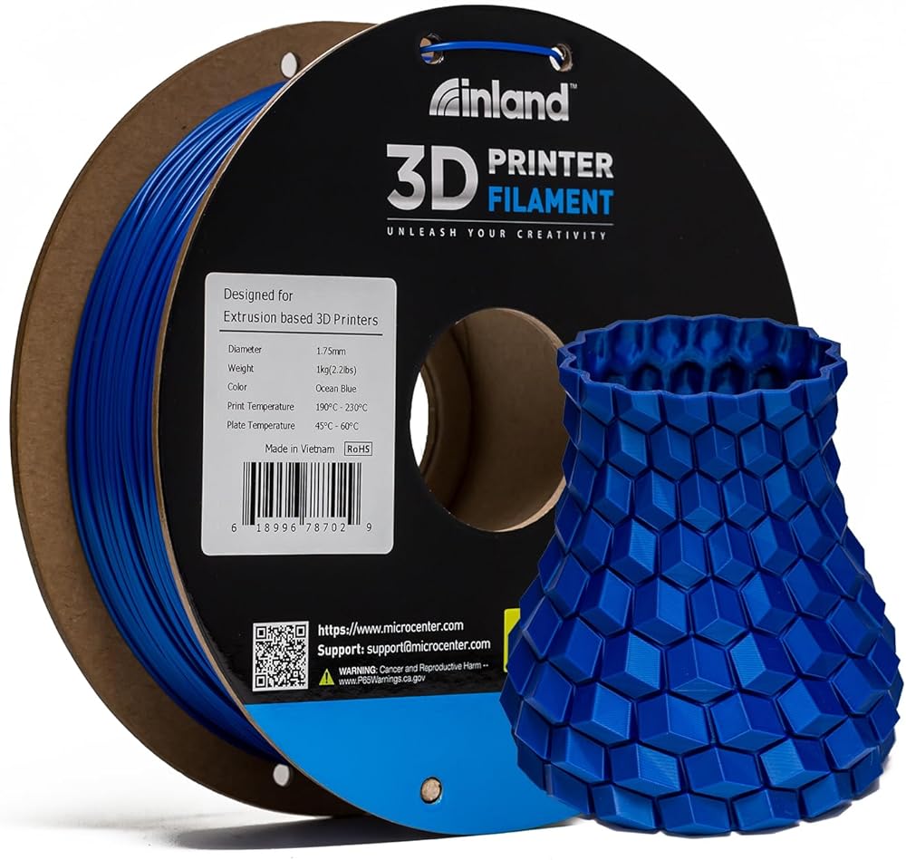 INLAND PLA FILAMENT: Designed with the highest quality and compatibility in mind, Inland PLA Filament undergoes numerous testing procedures to ensure that you spend less time troubleshooting and more time printing! Your filament will arrive completely dried and vacuum sealed with desiccant to ensure a high-quality smooth print.