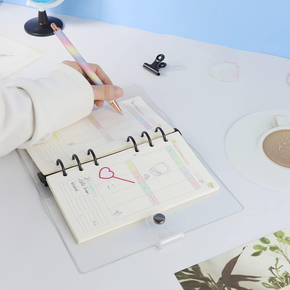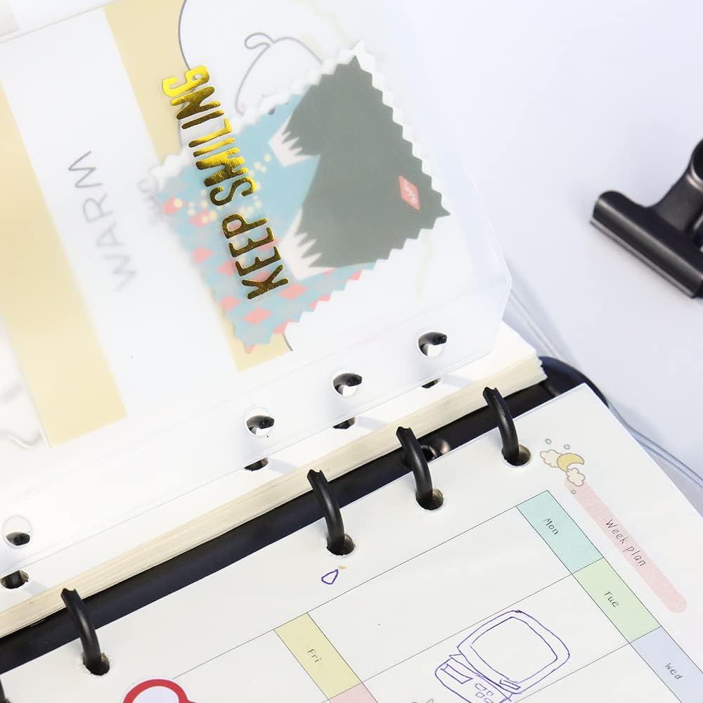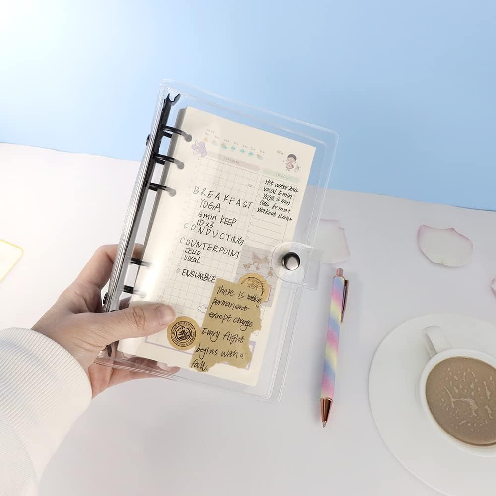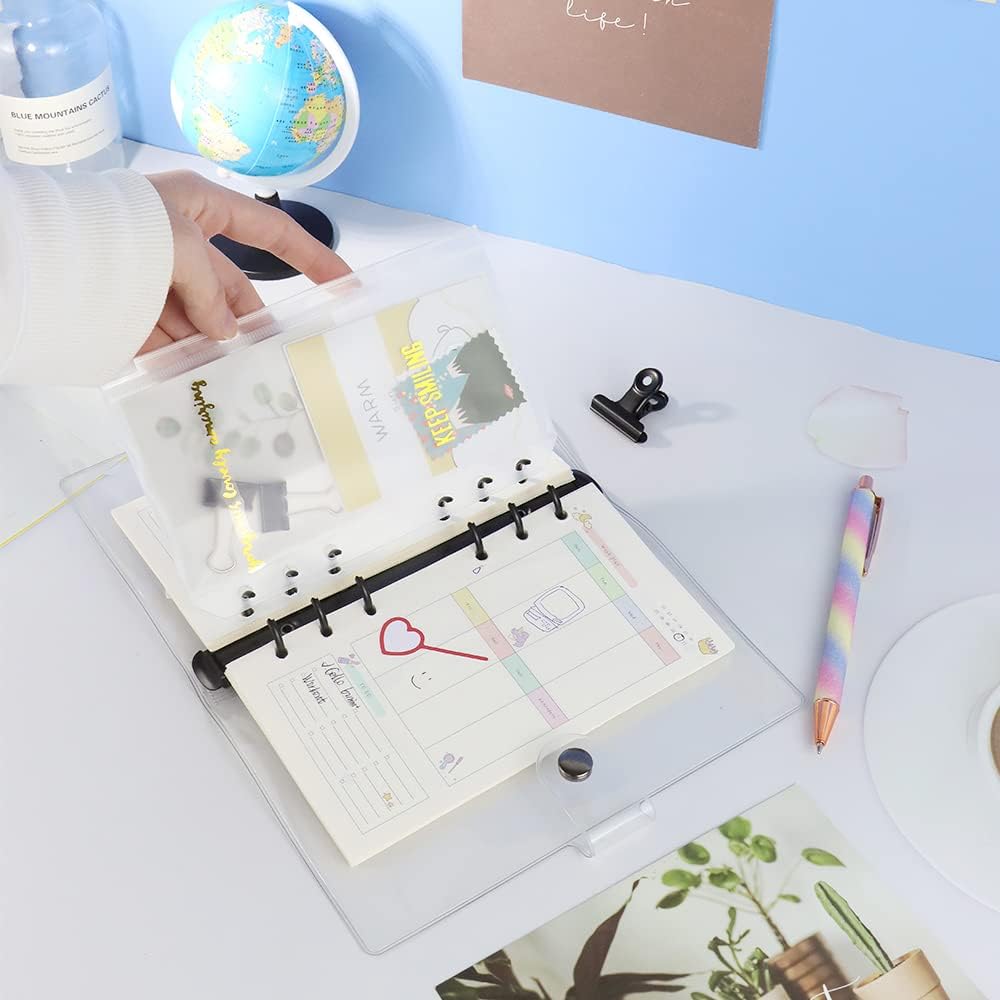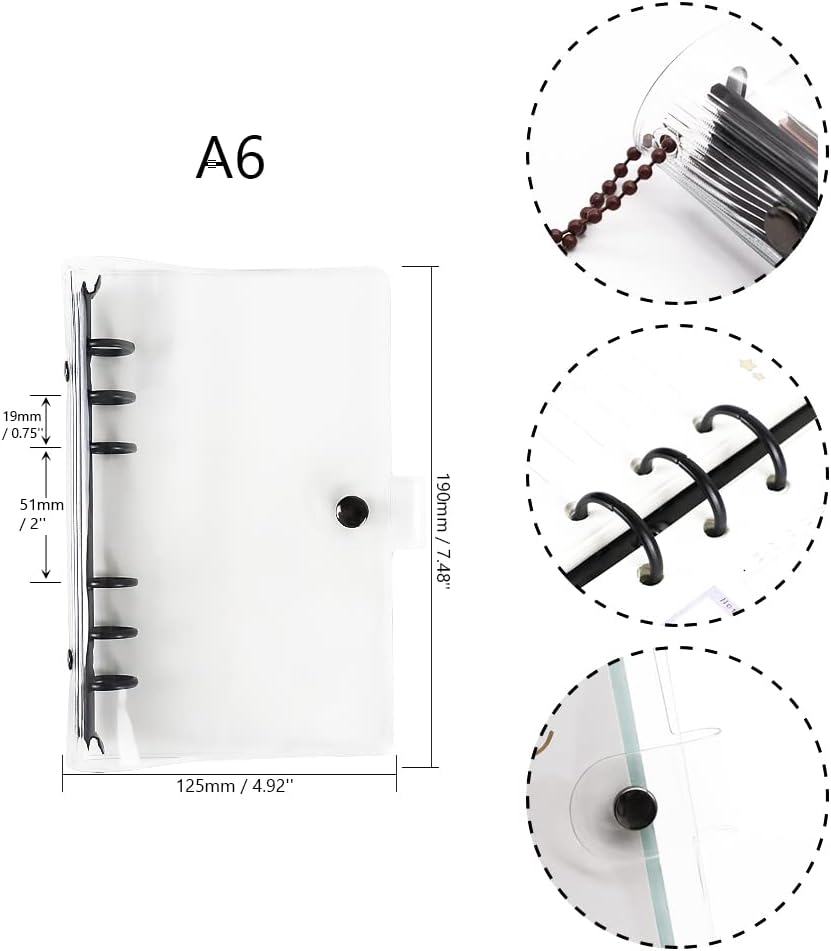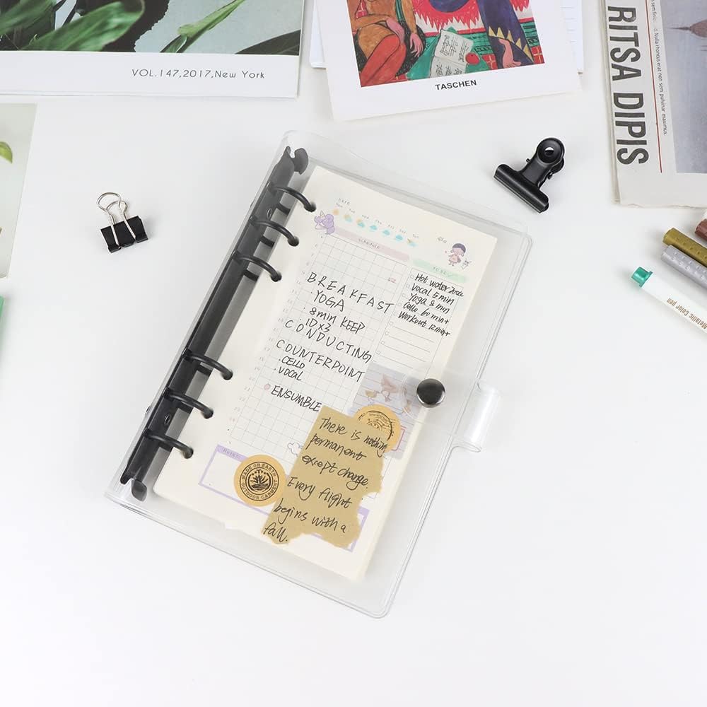 The binder is maleable and can be personalise yourself, with clear look, you can create to refill or customize to your liking. Binder cover is reusable, convenient to replace inner page by round ring design, which is easy to operate, pressing the 2 ends of switch to open the loose leaf ring, closing it by pressing the rings, fit for A5 size 6 holes refillable paper, binder pockets, cash budget envelopes, binder dividers, bookmark ruler etc;