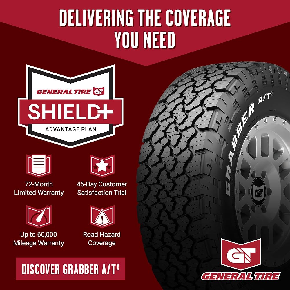 The General Grabber A/T X is an aggressive, all-season all-terrain tire for light trucks and SUVs that is backed by up to 60,000-miles of limited manufacturer tread life coverage. Balancing off-road capability, on-road performance, and aggressive looks, the Grabber A/T X features General's Duragen Technology that enhances strength and durability, delivers cut-and-chip resistance, and extends tread life.