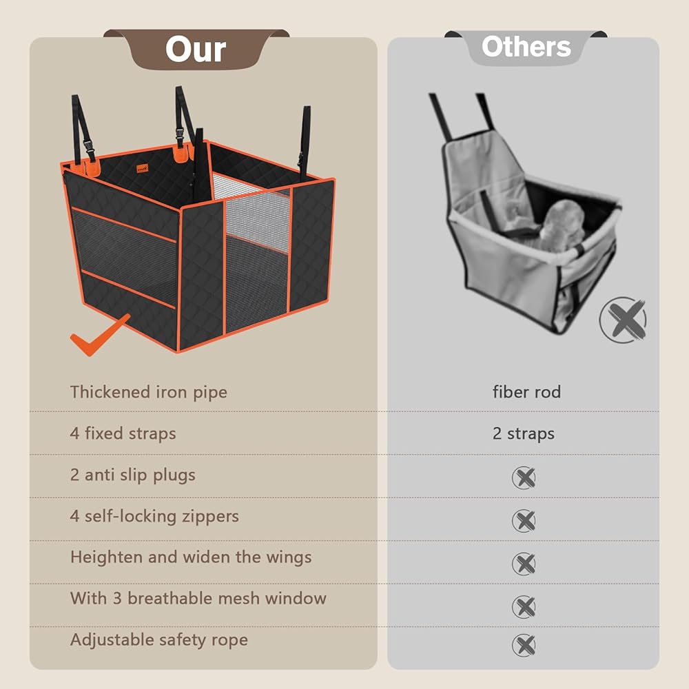 🐾【Stable Upgrade】Our extra stable dog car seat adopts a thickened hard mat bottom design, which is more stable than the fiber cloth bottom. Thick iron pipes are placed on the four sides to make the entire dog car seat more solid. Upgraded 4 fixed webbing straps and anti-slip devices make the seat less likely to shake when the car is driving, providing a more comfortable and stable seating space for your pet.