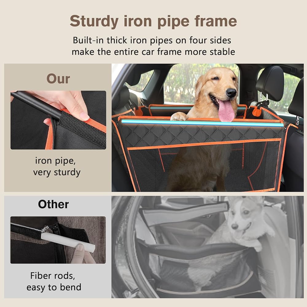 🐾【Easy Installation】Our dog car seat only takes a few steps. First, connect the two sections of pipes respectively. Second, insert the pipes into the four sides of the car seat. Third, after entering the car, insert the anti-skid plugs on both sides. Fourth, install the straps to the front and rear head restraints and tighten. Last, Zip up all four sides.