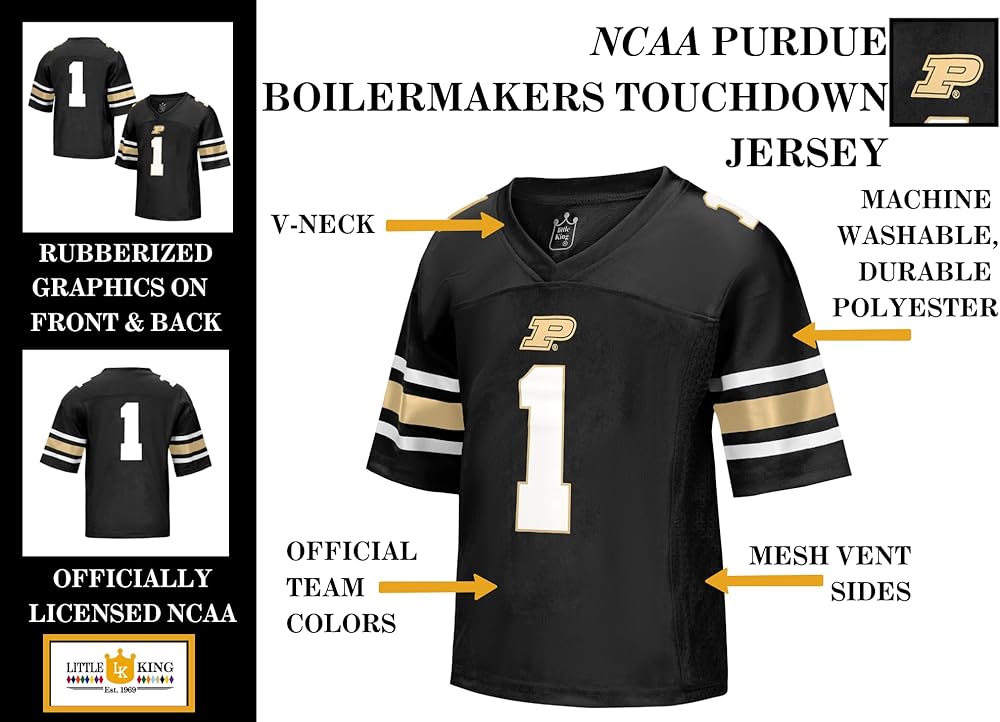 MATERIAL-DURABLE, LIGHTWEIGHT and FASHIONABLE 100% POLYESTER. This Boys/Girls NCAA teen boys Boilermakers JERSEY with Official Team Colors and Logos will become an essential part of your little fan's gameday wardrobe.