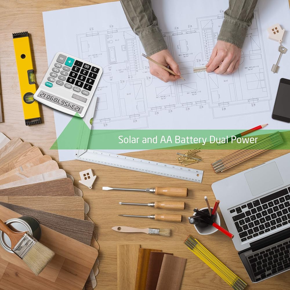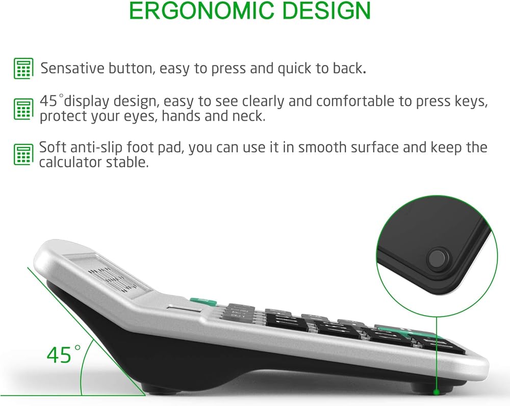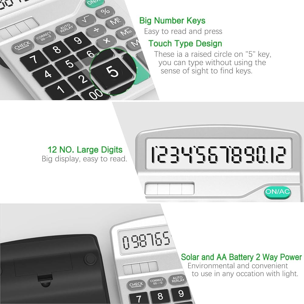 Calculator, Splaks Standard Functional Desktop Calculator Solar and AA Battery Dual Power Electronic Calculator with 12-Digit Large Display (2 Updated Silver)