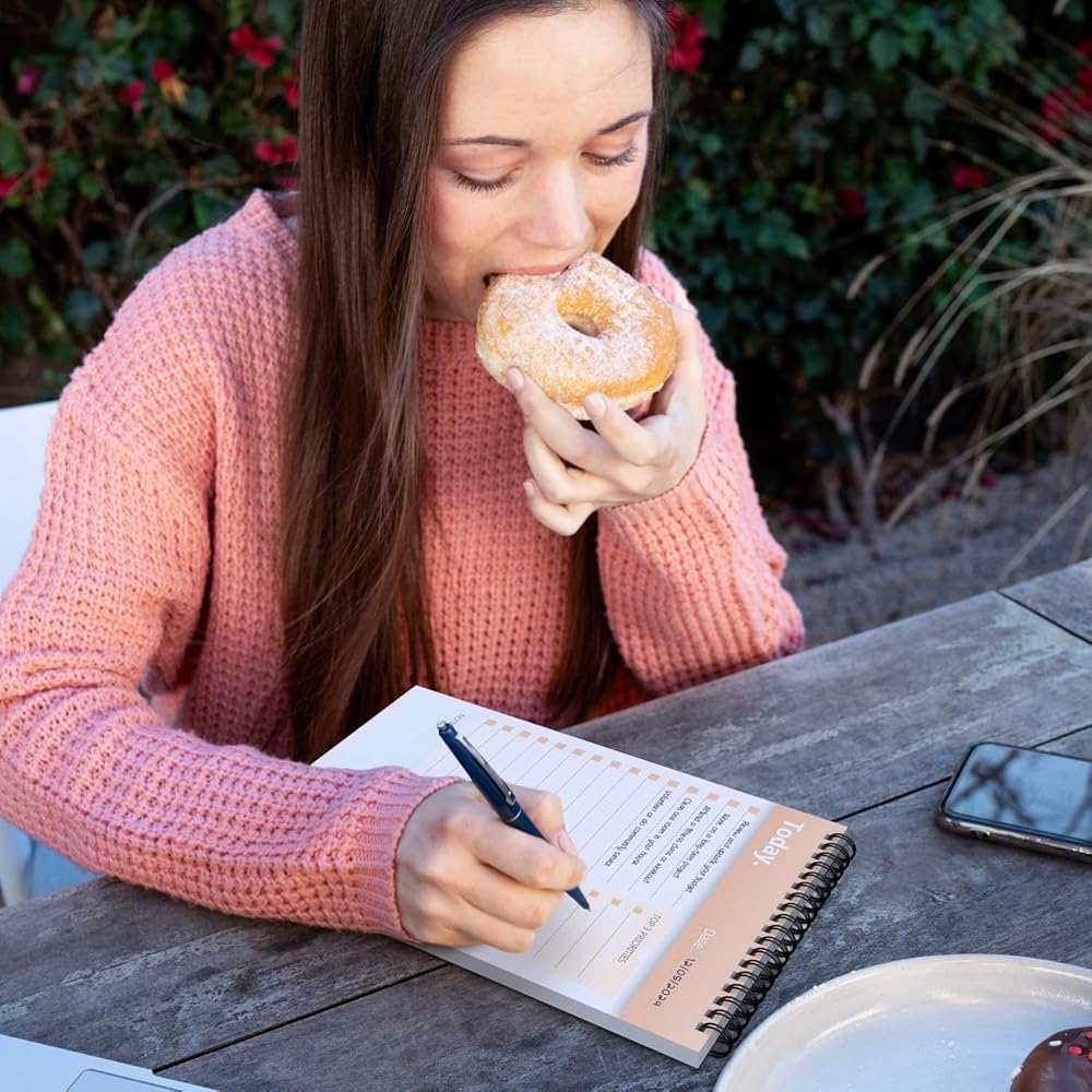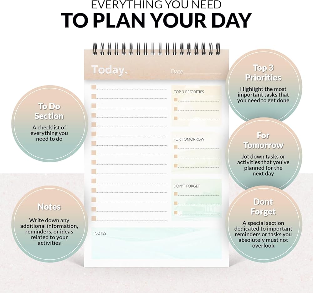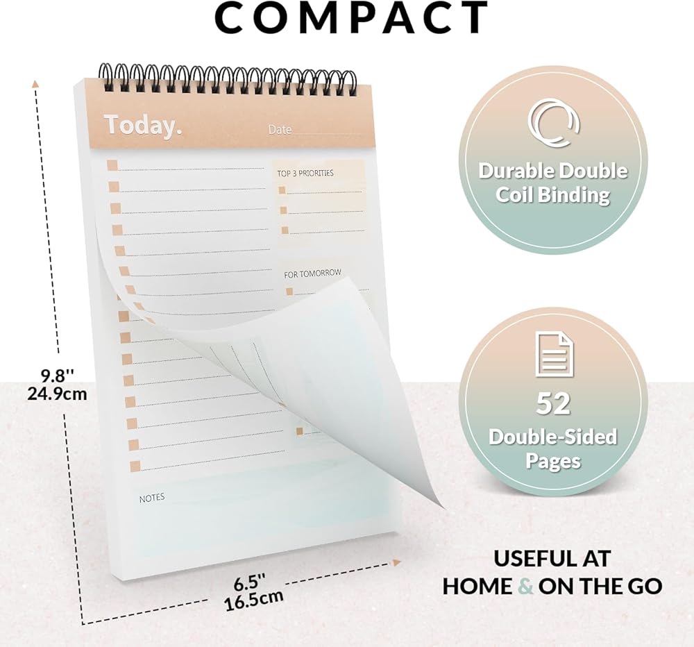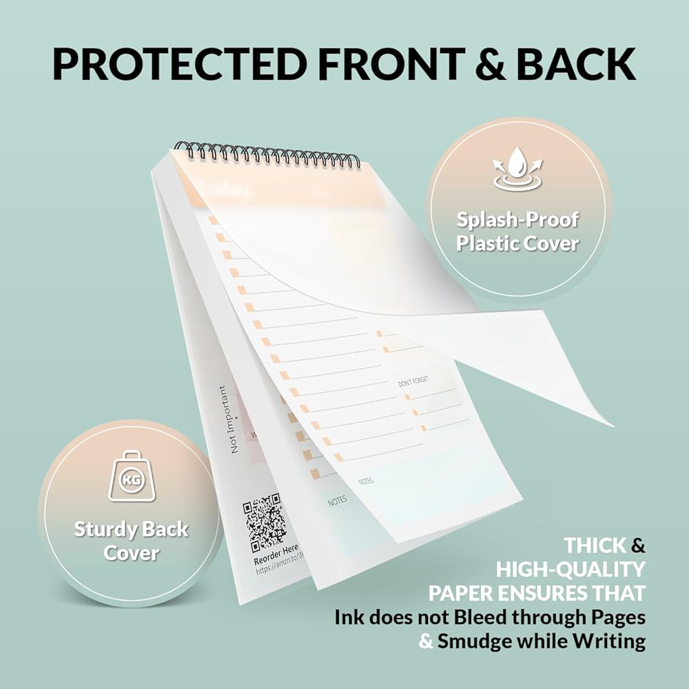 DURABLE DESIGN - The daily to do list is protected by a plastic cover from the front and a thick cardboard cover on the back. The back cover helps you write on the go while also protecting the contents of your to do planner. Durable double coil binding ensures that the papers are securely inside the to do notepad.