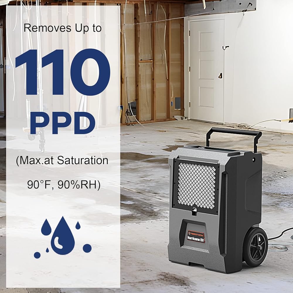 Large Capacity Dehumidifiers -- This commercial dehumidifier can remove 110 PDD moisture at saturation and 50 PPD moisture at AHAM. It is suitable for large workplaces up to 1300 sq. ft, such as new construction areas, plaster drying, basements/cellars, garages and crawl spaces.