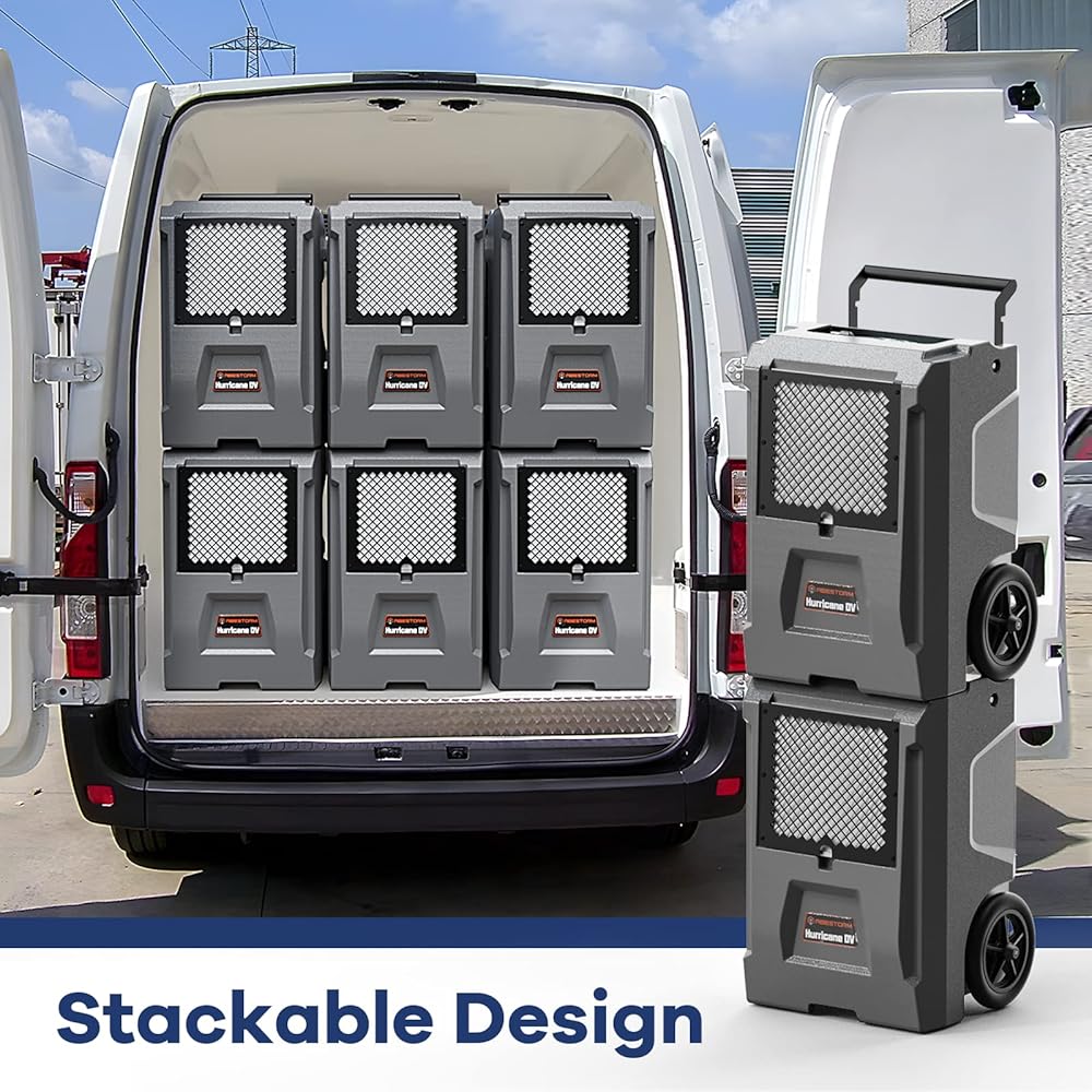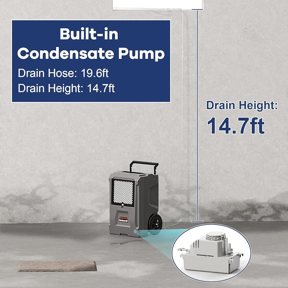 Convenient to Use -- The industrial dehumidifier with pump allows draining anytime, anywhere. Provides space to store 19.6 ft power cord and 19.6 ft condensate drain hose. The stackable design makes it easy to move and keep this small dehumidifier. The low-temperature operation, waterproof and automatic defrost function extends the service life of dehumidifiers.