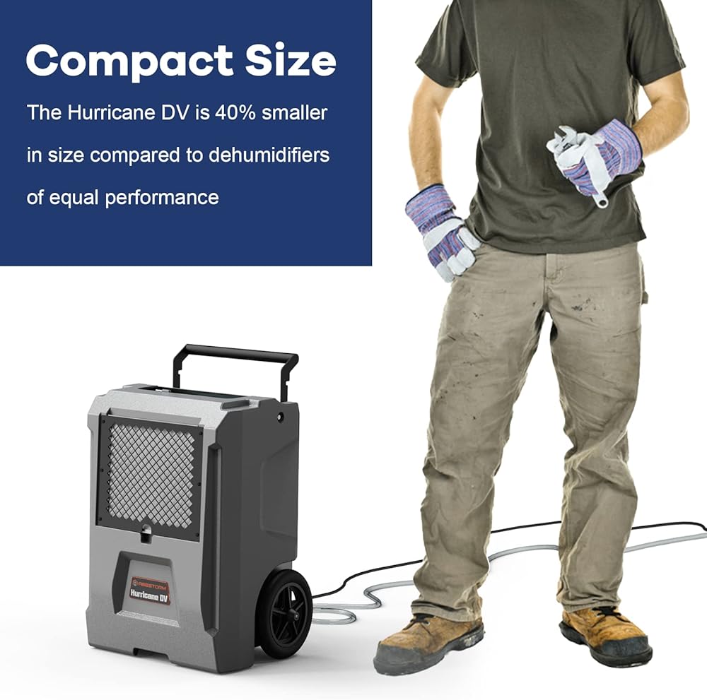 Portable Commercial Dehumidifiers -- Compact size of 17.0 1x 14.76x 23.23 inch and weight of 57.32 lbs; Under the condition of unchanged performance, the volume of whole dehumidifiers is 40% smaller. The Hurricane DV dehumidifier has a similar compact size to household dehumidifier, but its dehumidification capacity and performance are far superior to it.