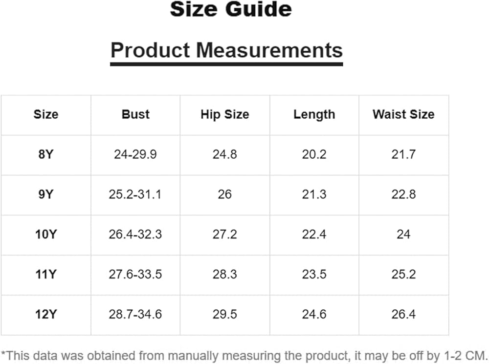 12Y:Bust:28.7-34.6IN,Hip Size:29.5IN,Length:24.6IN,Waist Size:26.4IN