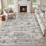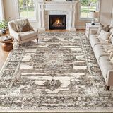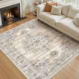 Washable 5x7 Area Rug for Living Room - Ultra Soft Vintage Carpet with Non-Slip Backing, Stain Resistant Low-Pile Indoor Rug for Bedroom & Home Office, Kid & Pet Friendly - Beige