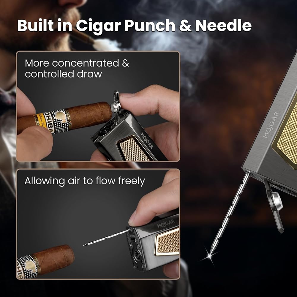 [4-IN-1 MULTI-FUNCTIONALITY] - The lighter's lid is expertly crafted with a unique recessed design to provide you with convenient, secure place to put your cherished items during relaxing moments. There are also 2 built-in punch accessories. It's a thoughtful touch that complements the best torch lighter's beauty and functionality.