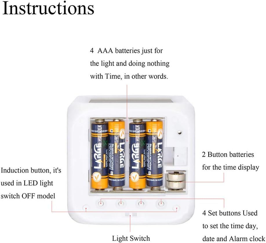 Alarm Clock LED light Worked by 4 x AAA batteries, LCD screen powered by 2x LR44 batteries.
