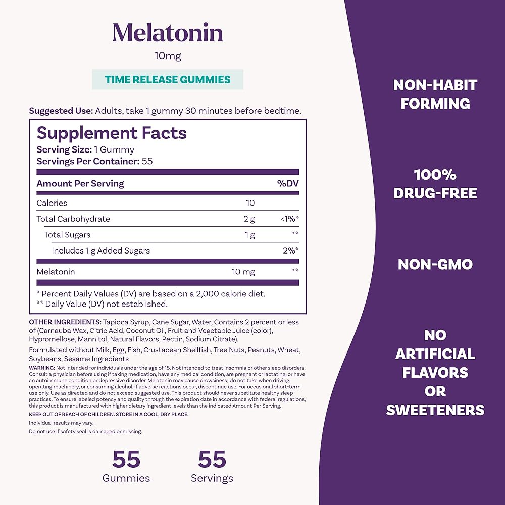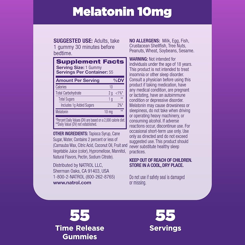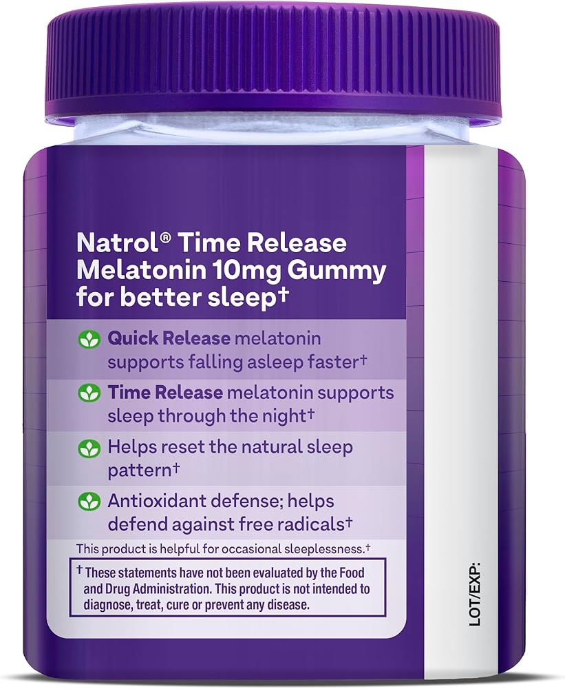 Natrol Time Release Melatonin Sleep Gummies offer a safe, effective and great-tasting dietary supplement option to help you fall asleep faster and stay asleep longer.(1) Helpful for occasional sleeplessness, these sleep supplements provide melatonin 10 mg, released through the night, to help minimize wake-ups and support sustained sleep.(1) Sourced from high-quality ingredients, these non-GMO adult melatonin gummies are a 100% drug free sleep support supplement made with clean ingredients- no artificial flavors, artificial sweeteners, artificial preservatives or synthetic dyes. They also contain no milk, egg, fish, crustacean shellfish, tree nuts, peanuts, wheat, soybeans or sesame. The great-tasting gummies have a fruity strawberry flavor that makes them easy-to-take anywhere. Adults, take one gummy 30 minutes before bedtime. From Natrol, the #1 drug-free sleep aid brand.(2)(1) These statements have not been evaluated by the Food and Drug Administration. This product is not intended to diagnose, treat, cure or prevent any disease.(2) Nielsen xAOC, 52 weeks endings 02/24/24, Sleep Aid Supplements