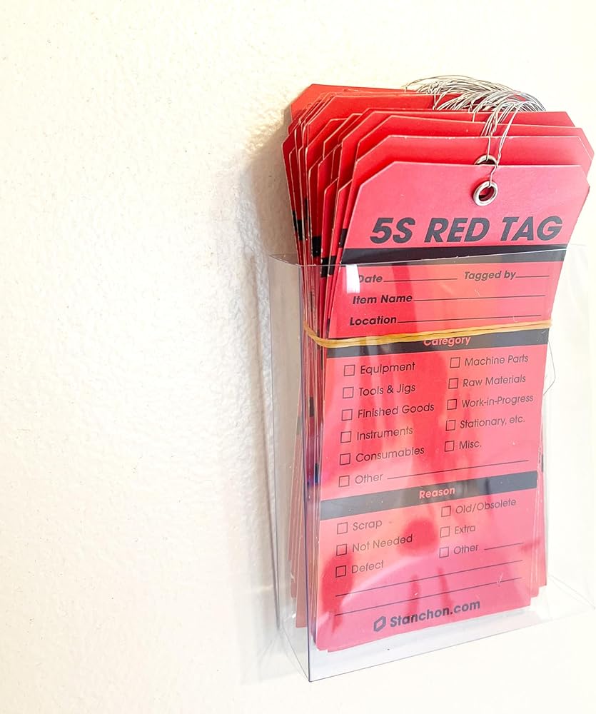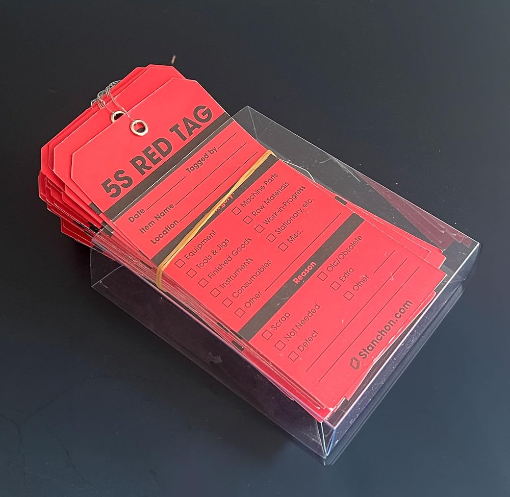 Crafted for unparalleled efficiency and durability, our 5S Red Tags redefine organizational standards. Made from the highest quality paper on the market, these tags are not just tools but a statement of premium organizational commitment. Each tag, sized at 3.25 x 6.25 inches, is intentionally designed to be larger than the standard 5S red tags, ensuring standout visibility whether in the bustling environment of a workshop or the structured order of an office. Gone are the days of struggling with flimsy elastic ties. Our tags feature robust 6-inch long wire ties, meticulously chosen to guarantee that once attached, they stay in place. This not only ensures longevity but also peace of mind that your organizational system remains intact in any setting. Understanding the value of your time, each tag comes pre-wired. This detail, seemingly small, significantly reduces the hassle during both the initial tagging process and later during storage, allowing for a seamless integration into your workflow. Our red tags are not just a product but a part of a movement embraced by thousands of companies worldwide. They stand as the gold standard for 5S Red Tags, a testament to quality, durability, and the pursuit of excellence in organizational practices. Choose our 5S Red Tags for an unmatched blend of visibility, reliability, and premium quality, and bring a new level of organization to your workspace.