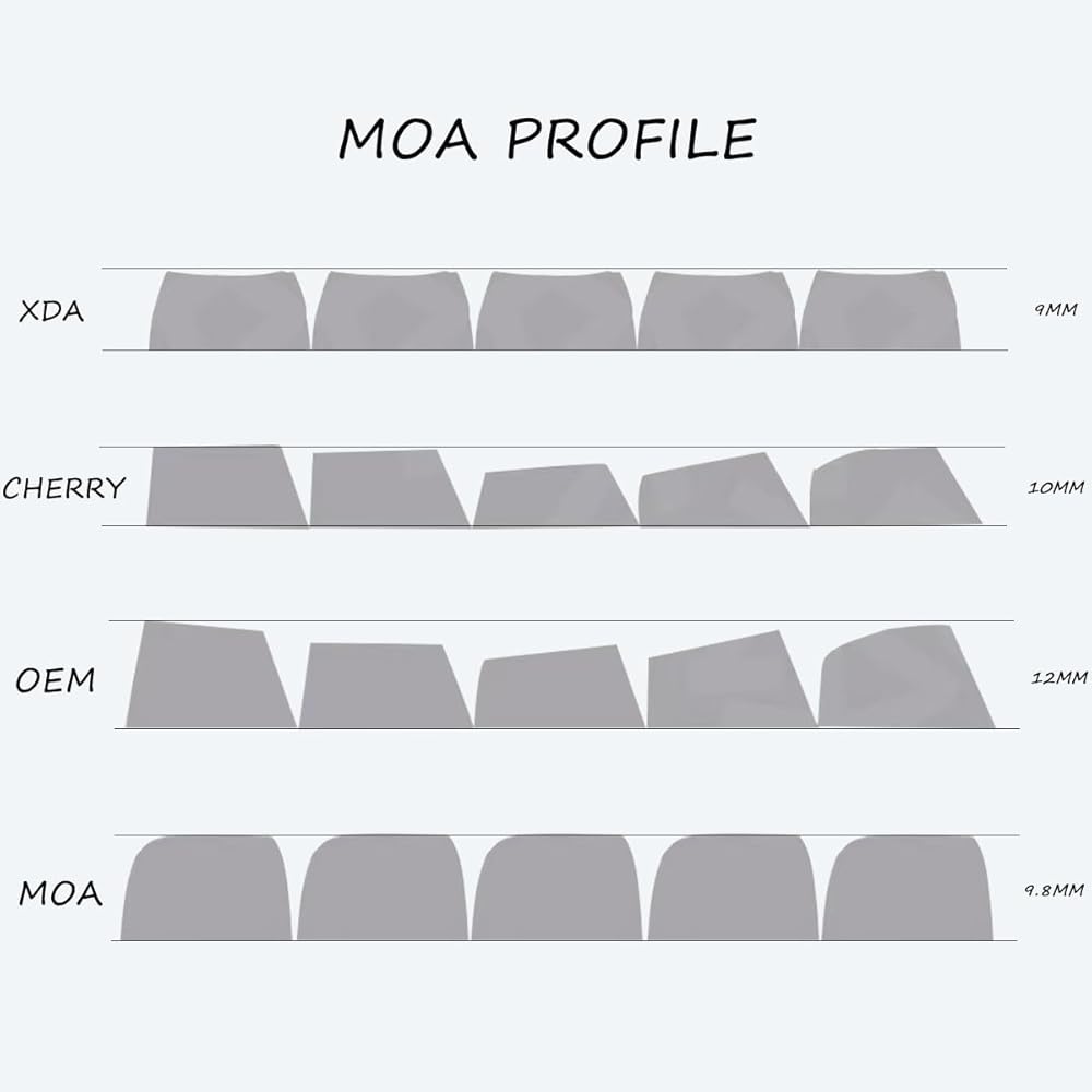 MOA Profile: MOA height is that all keycaps are of the same height. It is 9.8mm.The MOA profile keycaps compatibility with Cherry MX, Kailh Box, Gateron, Outemu mechanical gaming switches.