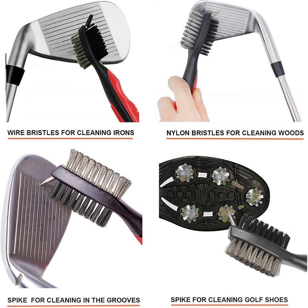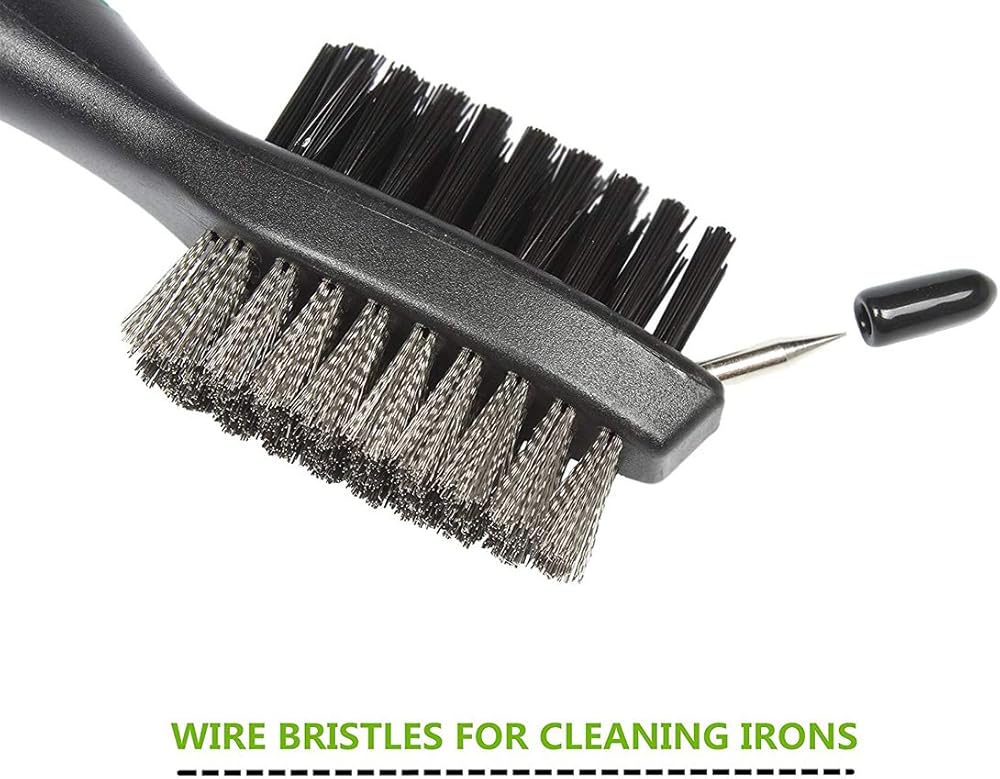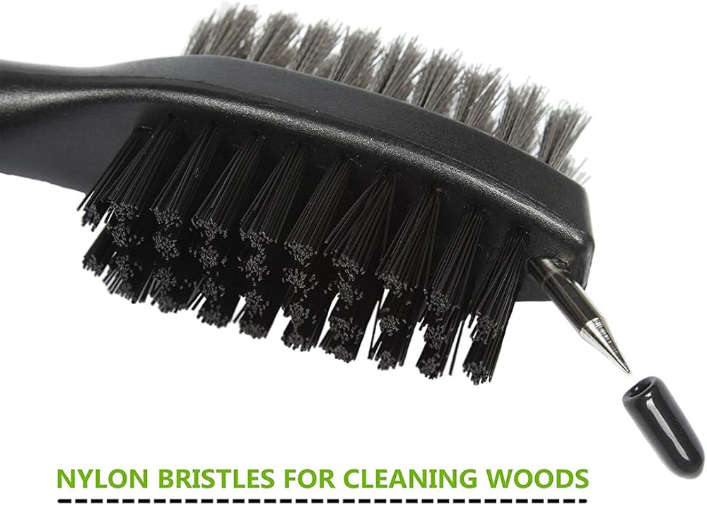 Wire bristles for quick and efficient cleaning of irons while on the fairway. Nylon bristles for easy cleaning of woods and shoe spikes/cleats. Sharp pick for stubborn dirt and grime in grooves