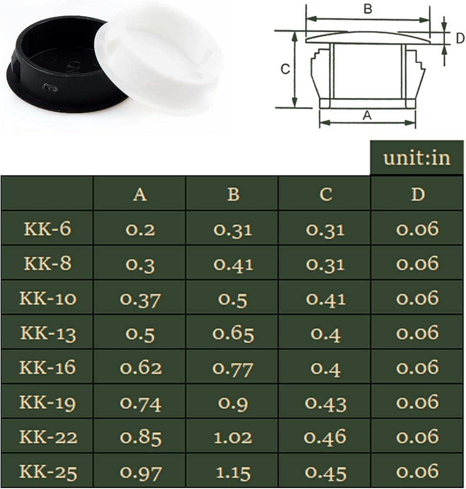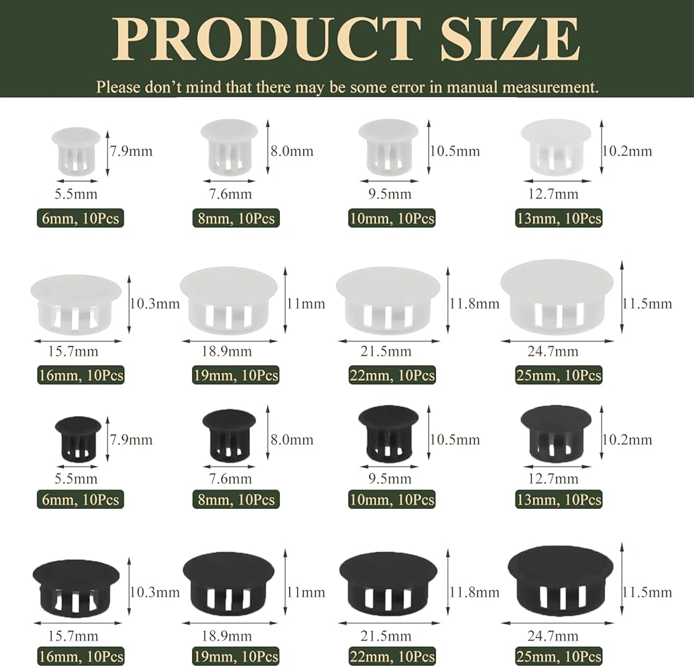 • 8 Sizes:Available in 1/4" (6mm), 5/16" (8mm), 2/5" (10mm), 1/2" (13mm), 5/8" (16mm), 3/4" (19mm), 7/8" (22mm), 1" (25mm). Each hole plug is clearly marked with size for easy distinguish.