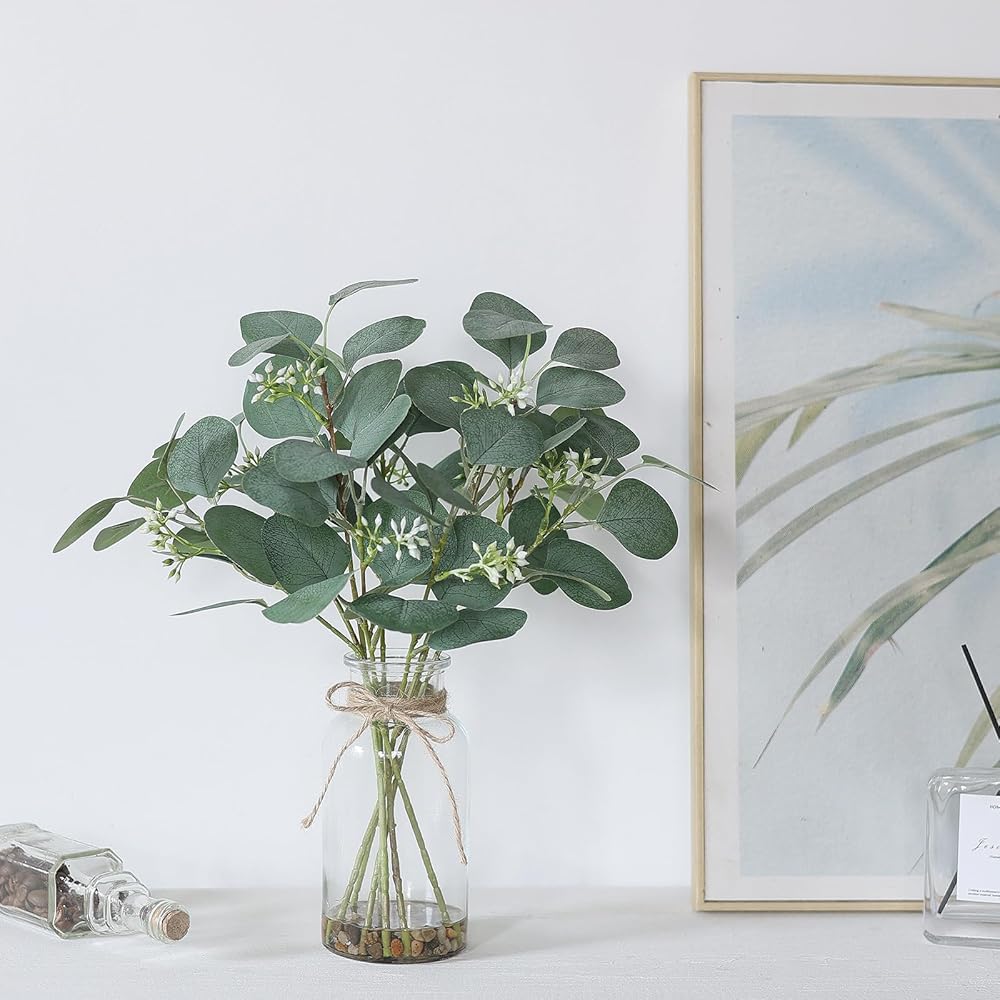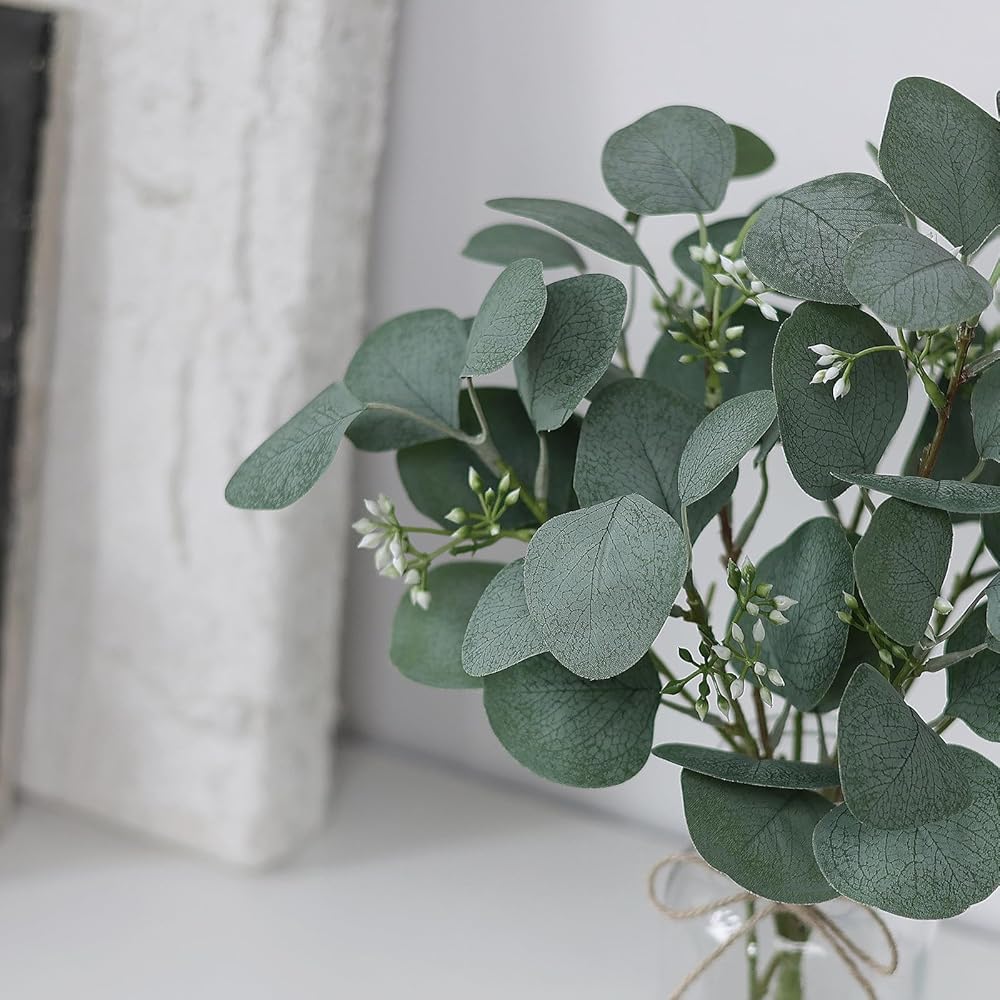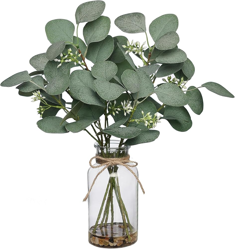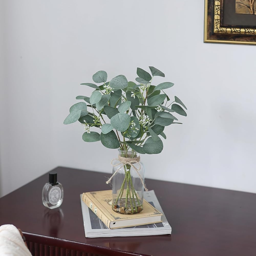 [Realistic eucalyptus leaves]: These artificial eucalyptus leaves and trunks are made from high-quality silk and plastic to mimic the look and feel of real eucalyptus, paired with high-quality glass vases and realistic artificial water contains small stones to create a natural touch and add vitality to your home decor.