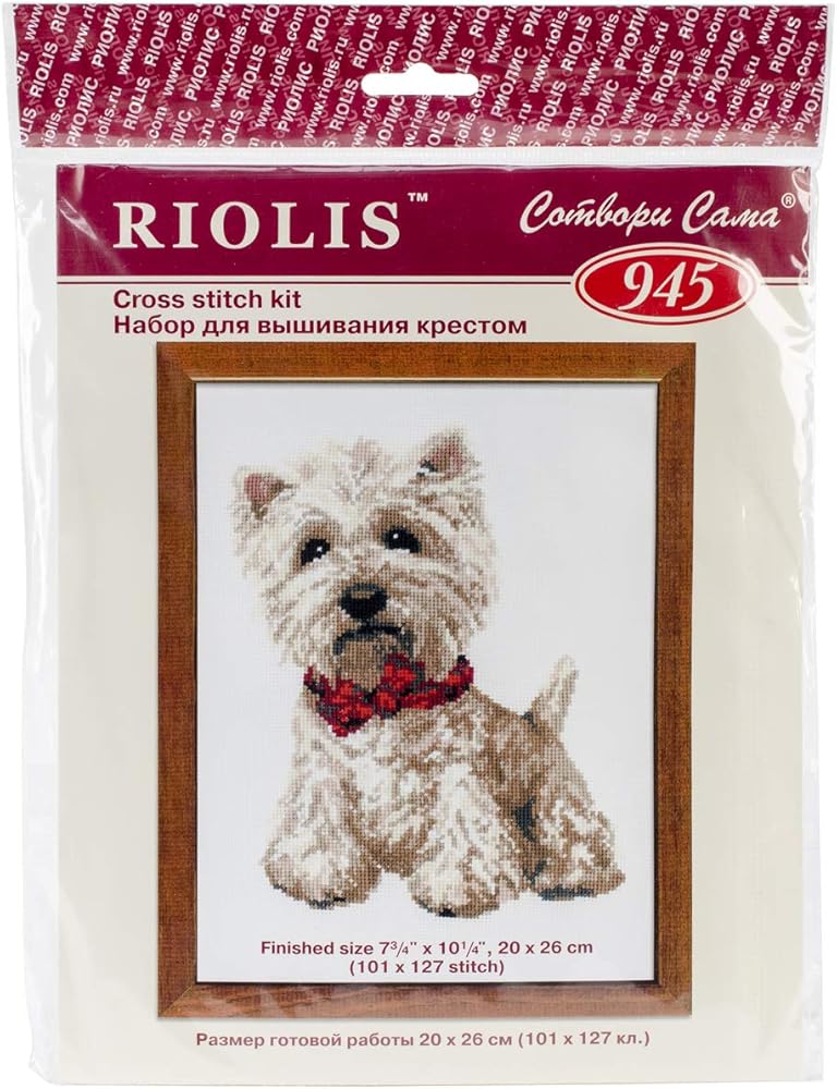 RIOLIS-Counted Cross Stitch Kit. Express your love for arts and crafts with these beautiful cross stitch kits! Find a themed kit for any taste! This package contains 16 count even-weave white cotton fabric woolen and acrylic yarn and one needle. Design: West Highland White. Finished size: 10-1/4x7-3/4 Inch. Imported.