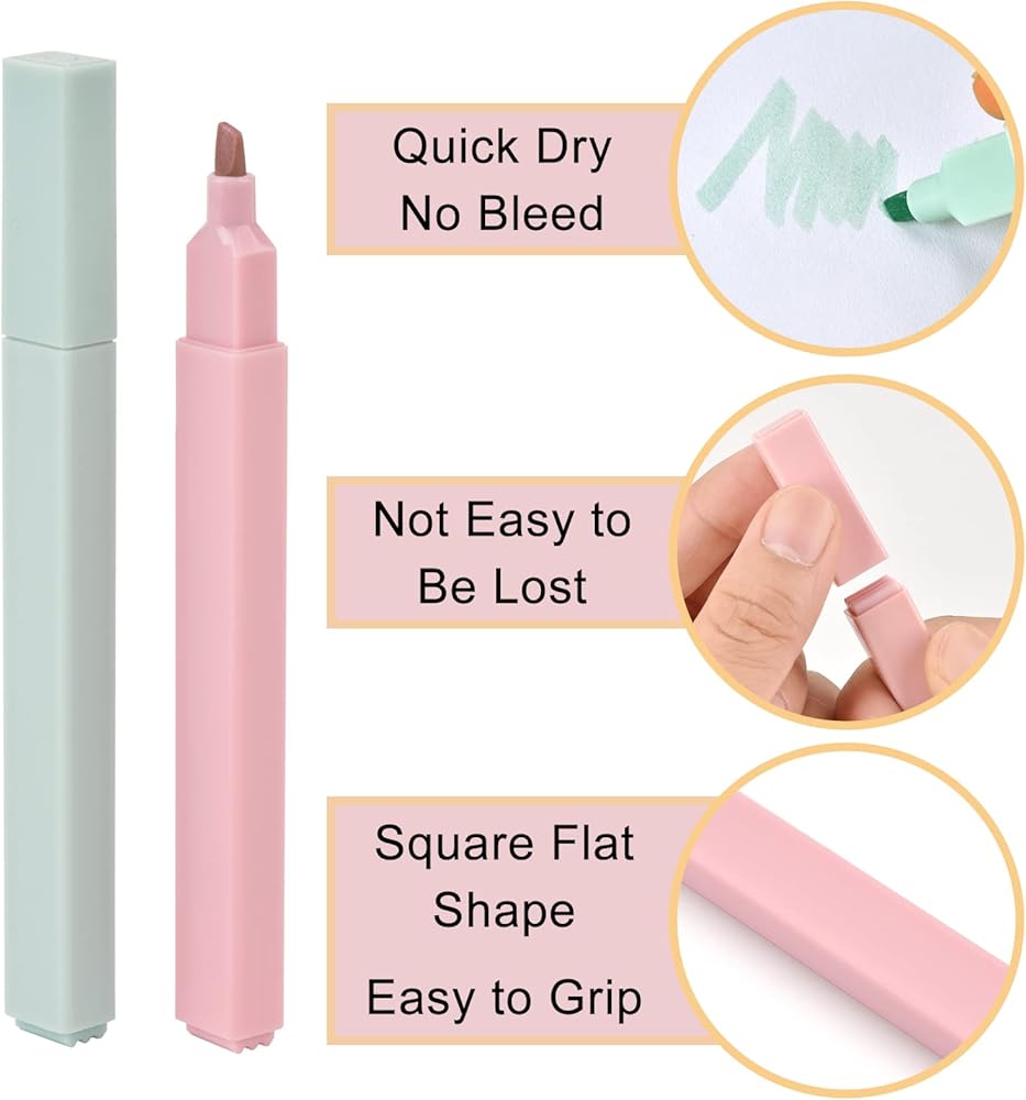 Gentle and Subtle Colors: The mild color highlighters come in a set of 24 assorted pastel colors that won't strain your eyes or distract you from your work.These aesthetic highlighters help you keep your notes and documents organized and visually appealing.