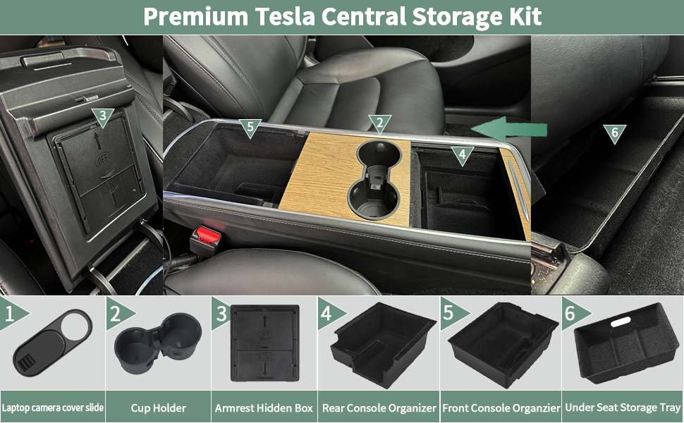 Package include: 1 x center console tray, 1 x armrest storage box tray, 1 x armrest hidden storage box, 1 x camera privacy protection cover, 1x Cup Holder, 1x Under Seat Storage Tray, as our pics shown. Compatible with 2021 2022 2023 2024 Tesla Model Y.