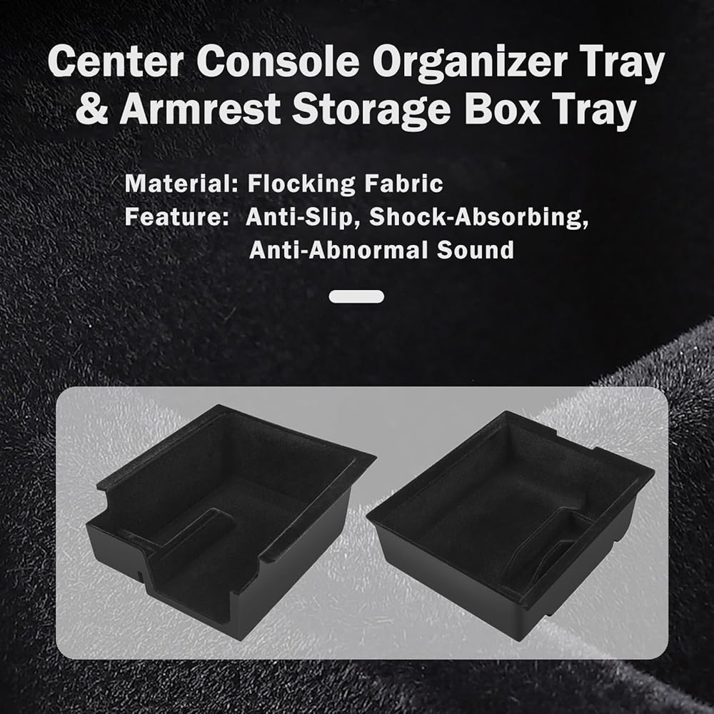 Center console & Armrest & Under Seat storage tray: Center console & Armrest storage tray are made of durable black ABS plastic casing and the inner lining is flocked material. Under Seat storage tray is made of durable ABS plastic and felt fabric. Effectively prevent things from sliding and making abnormal noises in the tray, and prevent damage to small items. The Center Console Organizer Tray has openings designed to allow the phone cable to extend from the bottom to the top.