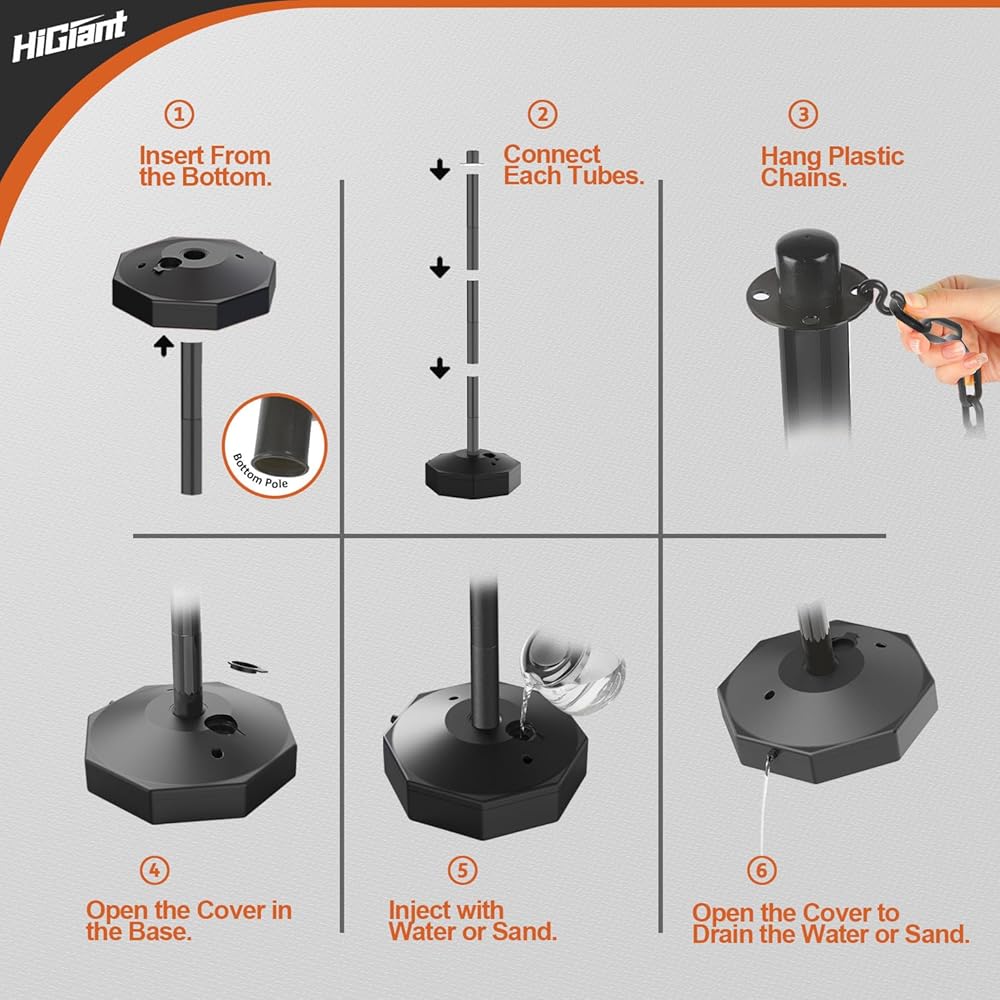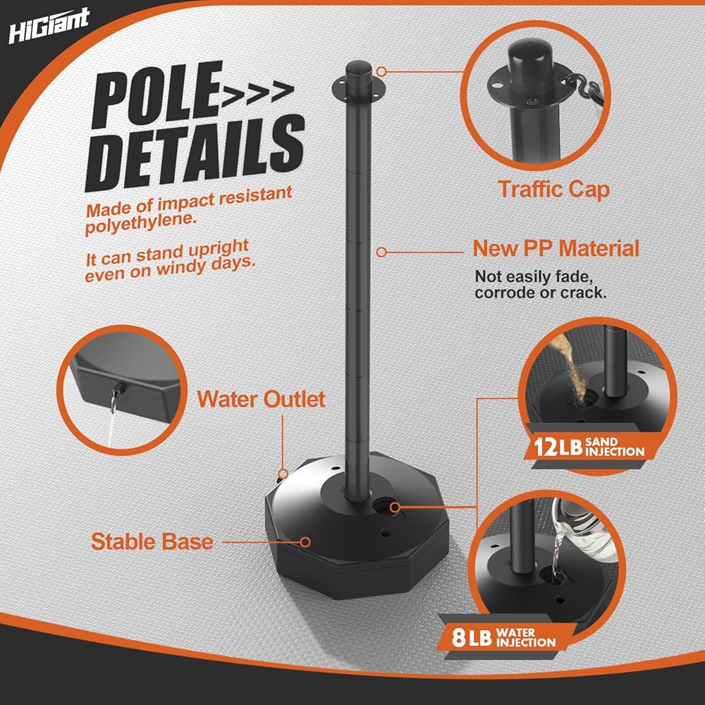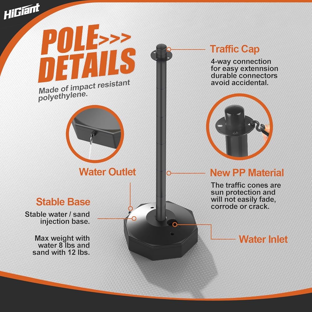 FILLABLE STURDY BASE - Each traffic post cone include a water injection base, 1 cap, 6 sections and 8Ft Plastic Chain. The base weighs 8lbs with water or 12lbs with sand. That makes the cones keep blown over by winds and stay upright when attached to plastic chains.