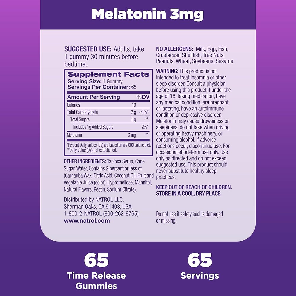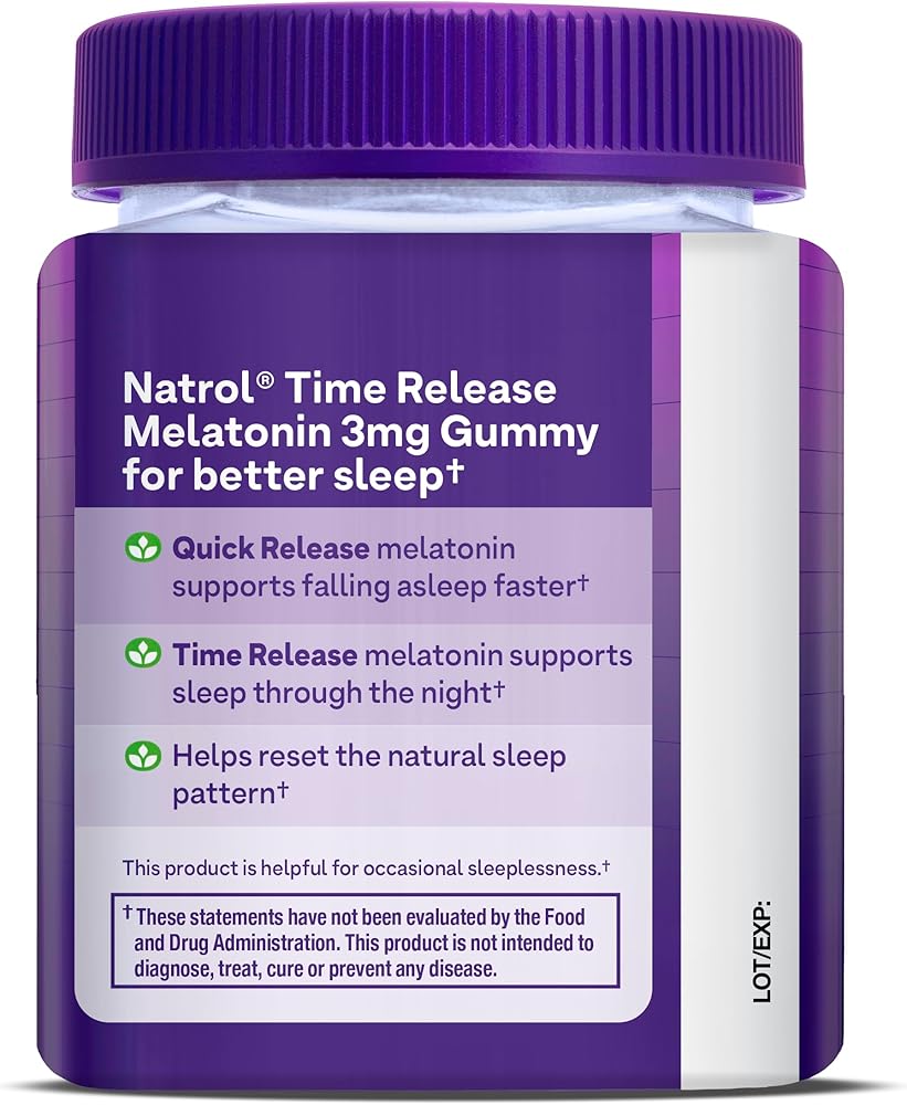 Natrol Time Release Melatonin Sleep Gummies offer a safe, effective and great-tasting dietary supplement option to help you fall asleep faster and stay asleep longer.(1) Natrol formulated these sleep supplements to provide melatonin 3 mg, released through the night to help minimize wake-ups and support sustained sleep.(1) Sourced from high-quality ingredients, these non-GMO adult melatonin gummies are a 100% drug free sleep support supplement made with clean ingredients- no artificial flavors, artificial sweeteners, artificial preservatives or synthetic dyes. These melatonin supplements for sleeping also contain no milk, egg, fish, crustacean shellfish, tree nuts, peanuts, wheat, soybeans or sesame. The great-tasting nighttime sleep aid gummies have a fruity strawberry flavor that makes them easy-to-take anywhere. Adults, take one gummy 30 minutes before bedtime. From Natrol, the #1 drug-free sleep aid brand.(2)(1) These statements have not been evaluated by the Food and Drug Administration. This product is not intended to diagnose, treat, cure or prevent any disease.(2) Nielsen xAOC, 52 weeks endings 02/24/24, Sleep Aid Supplements