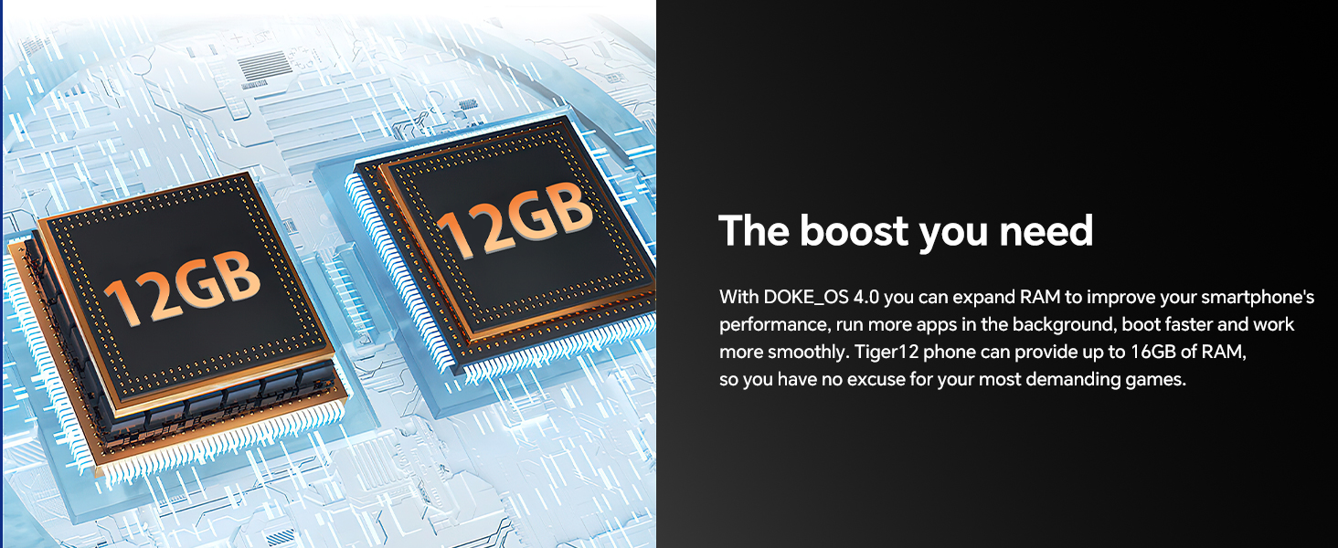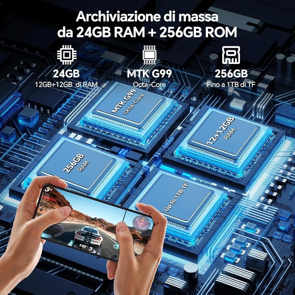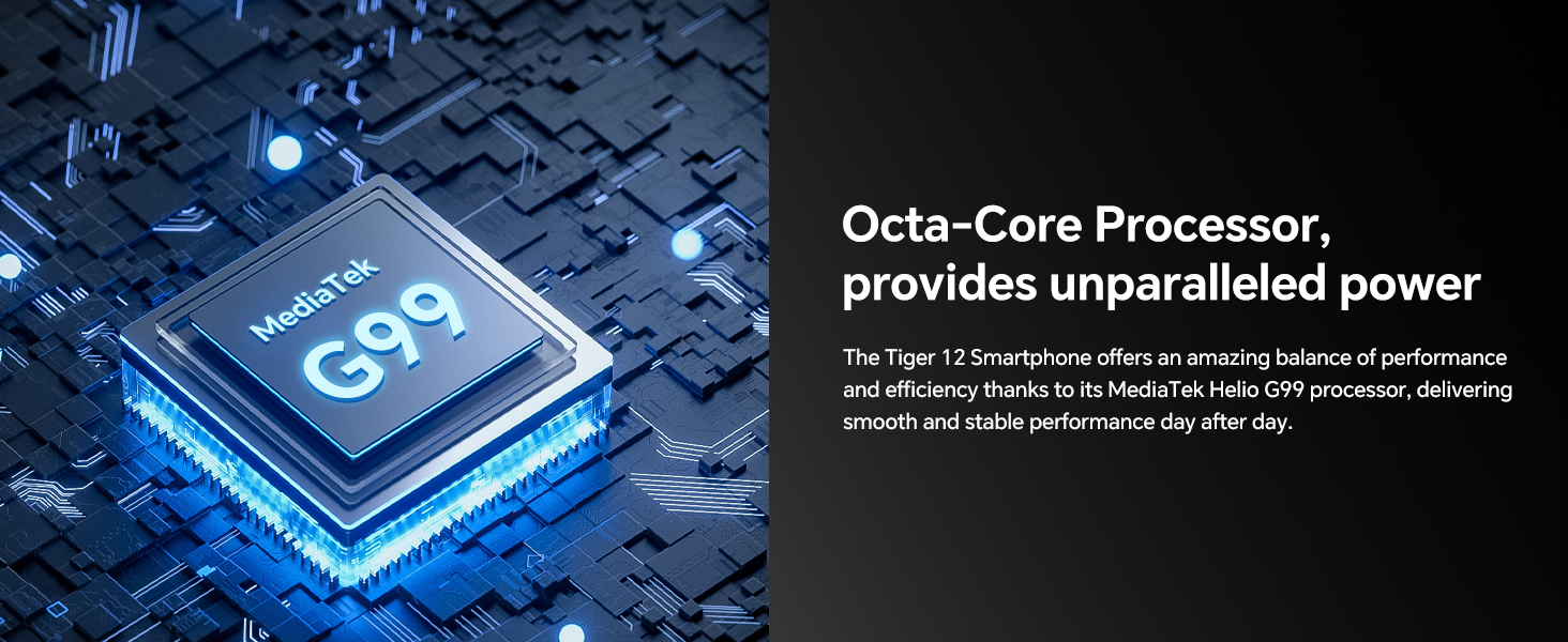 πγMediaTek Helio G99, 24GB RAM 256GB ROMγEquipped with the Helio G99 chip using an efficient 6nm process, it offers outstanding performance in CPU-intensive gaming. With 24GB RAM(12GB Extended), it ensures maximum work productivity without interruption. Tiger12 Unlocked Android Phones supports 256GB ROM expandable up to 1TB with Micro SD, completely solve your storage problems.